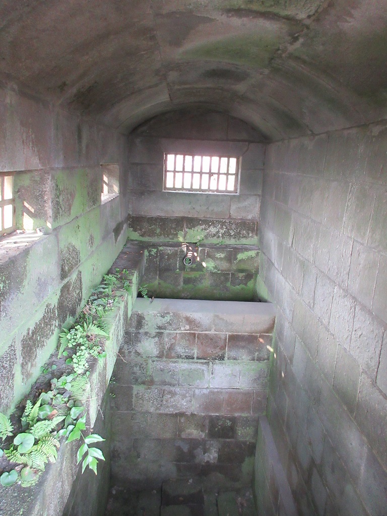 仙厳園を訪れた際、御殿の見学を終えて一段高い裏山側の道を進むと、石造の濾過池の遺構が残されていました。平屋の小さな室のようになっていて、入り口の格子の隙間から覗くと石を組みあせた水槽のようなものが見え、そこで水をろ過して御殿に給水していたここが分かりました。幕末の建物と思ったのですが、意外と新しく明治時代に作られたのだそうです。ひっそりとしていて訪れる人も少なかったです。
