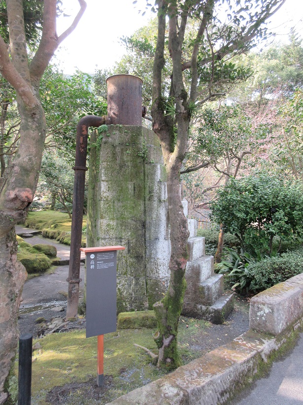 仙巌園の中には水力発電所用のダムの後や濾過池など近代文明の初期の形態を知ることのできる遺跡が多いのですが、この高枡もその一つで、園内の湧水をこちらに集めて、分岐させ各所に送っていた施設とのこと。ちょっとピンときませんでしたが、いわば音声をコントロールする電話交換機に近い役割で、それを水でコントロールする施設であったのしょうね。