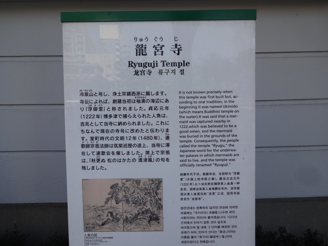 とらえられた人魚を吉兆としてこちらのお寺に収め、それにちなんで寺の号が「龍宮寺になったと、案内板に書かれていました。