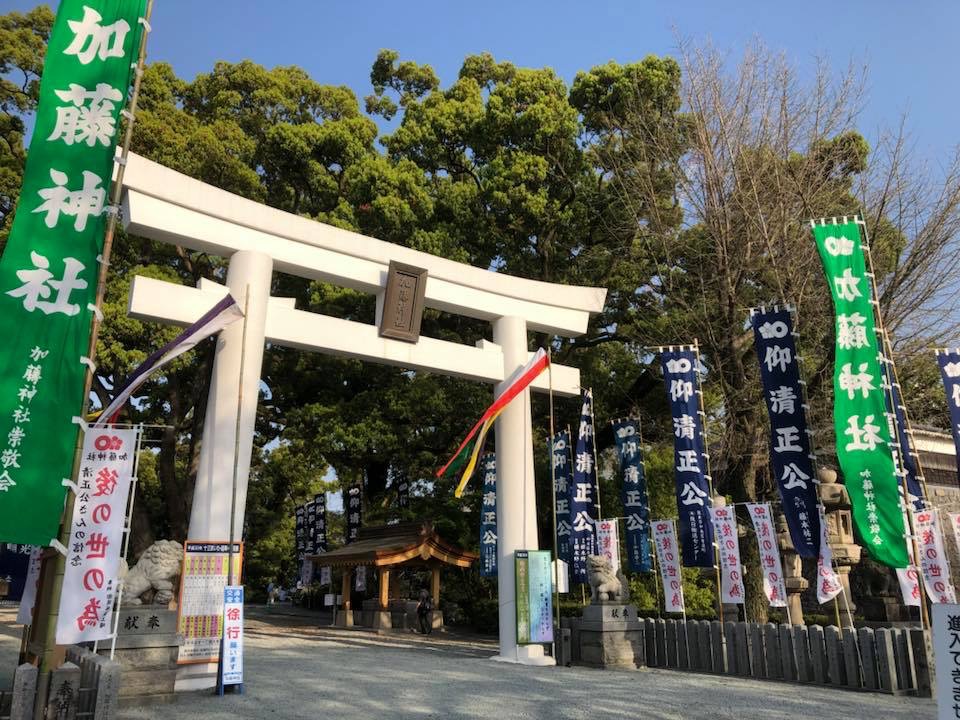 主祭神を加藤清正公とする加藤神社で境内からの熊本城の静観は、近望の名所として有名ですが、今は復興を願う名所として沢山の観光客でにぎわっています。