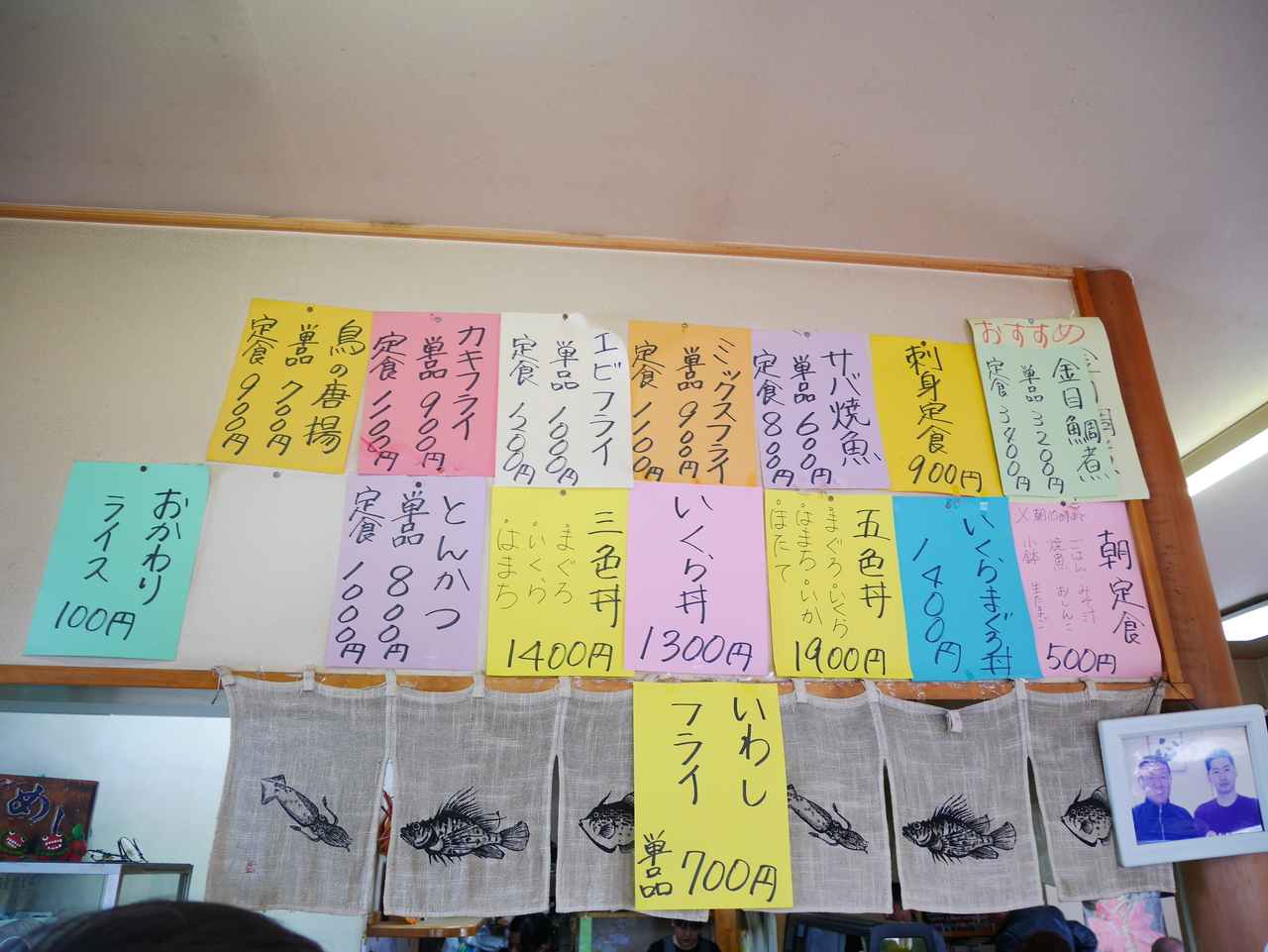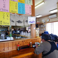 魚料理がメインの食堂で、店内はカウンター席と小上がりのテーブル席がありました。