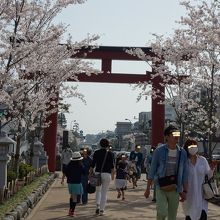 鎌倉の鶴岡八幡宮の前には三つの鳥居が有ります。真ん中がこちらの二の鳥居です。ここから三の鳥居までは段葛と呼ばれる遊歩道が続きます。ちょうど桜の季節で遊歩道の両側に植えられた桜が満開で大変きれいな風景を作っていました。