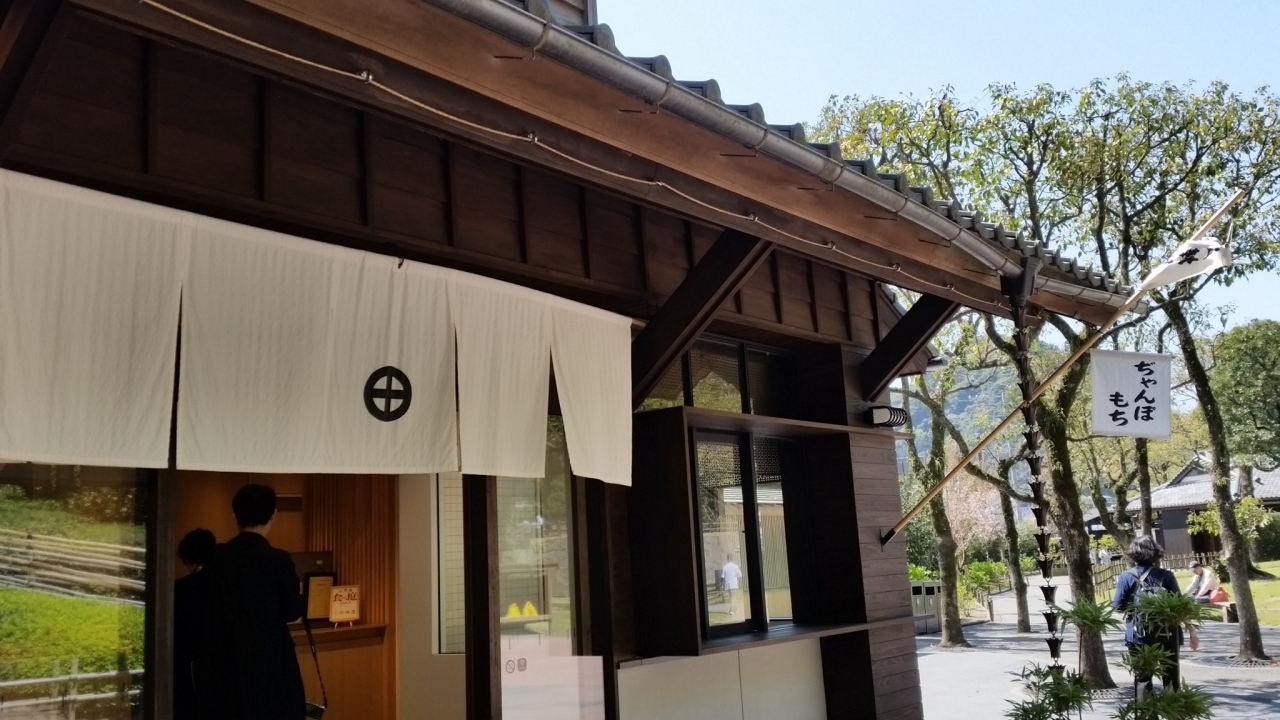 仙厳園に入って、右側に歩いてすぐの所にあるお店です。「じゃんぼもち」ののれんがひらひらしていますのですぐわかります。6本入りか10本入りでは多いと思い、2本入りとコーヒーのセット420円を注文しました。みそと醤油各1本。一口サイズなので、6本でも食べられたかな?そちらにはお茶が付いているし・・・もちは柔らかくて美味しかったです。
