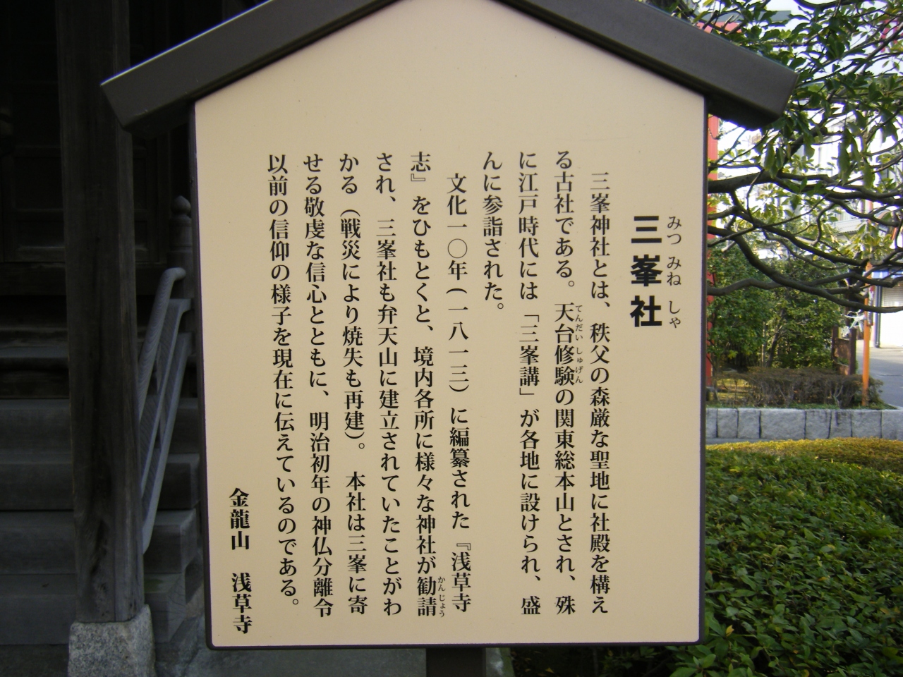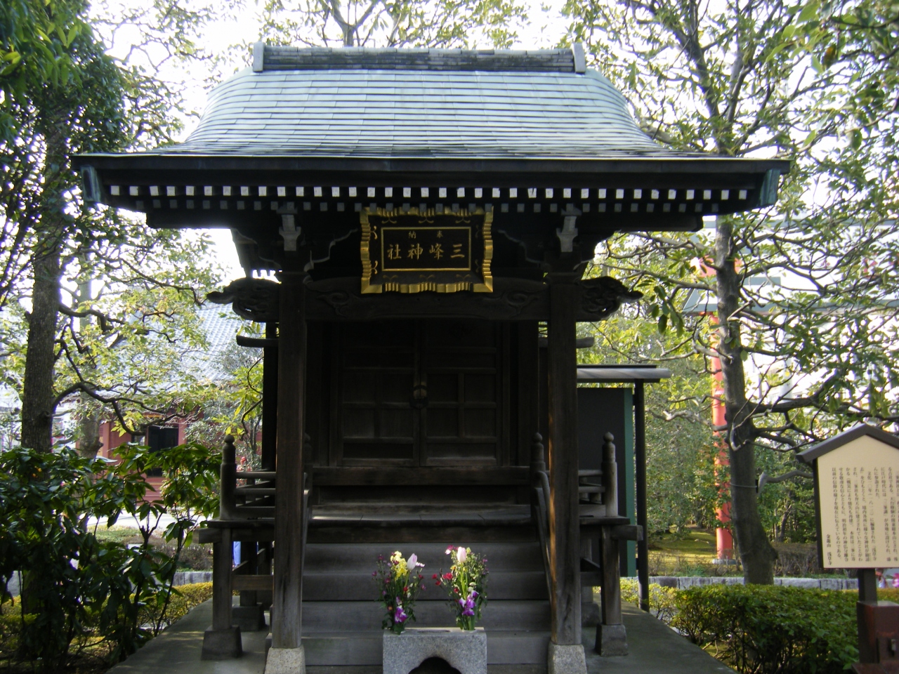 浅草寺境内の影向堂のすぐ南西にある小さな神社になります。三峯神社は秩父にある古社であり、江戸時代に秩父まで行かなくてもよいように勧請したのではないかといわれているそうです。かつては浅草寺の弁天山にあったそうですが、戦災により焼失し、その後この場所に再建されたとのことです。小さな神社ですが、美しい造りの神社で見ごたえがあってよかったです。