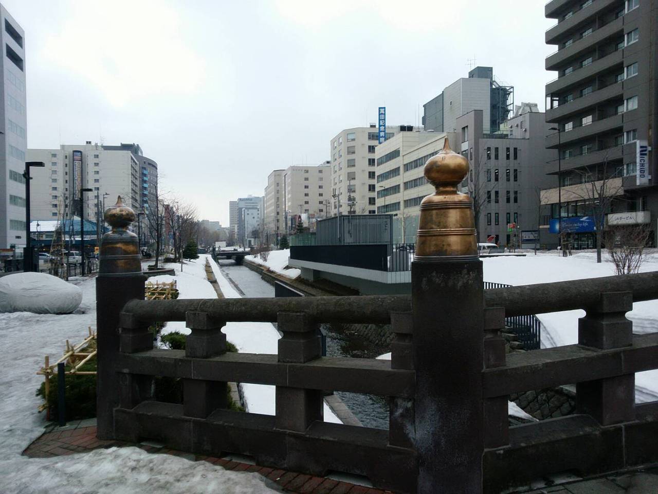 札幌の中心地を南北に流れる創成川沿いにある公園です。さっぽろテレビ塔や二条市場などの観光スポットからも近くにあるので、札幌市内観光をしているときに立ち寄りました。夏場なら緑豊かなキレイな公園のようですが、残雪が残る公園内は真っ白な公園で殺風景な感じでした。