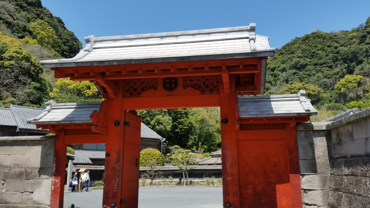 仙厳園は広いですが、ここは右手に進んで御殿への通用門となっている物です。昔は当主と世継ぎしか、ここを通れませんでしたが、今ではもちろん誰でも通れます。江戸時代はここが正門だったとか。屋根は薩摩で取れた錫で葺かれていて、重量が1トンとか。