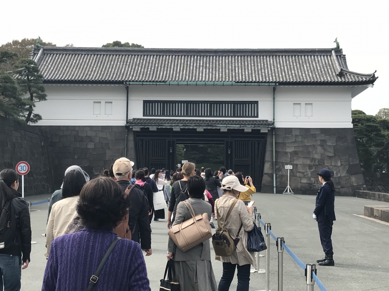 入場口で、荷物検査とセキュリティチェックを済ませて、坂下門から乾通りに入ります。桜は期待したほどではありませんでしたが、宮殿や宮内庁など普段は見られないものを巡るコースは新鮮です。