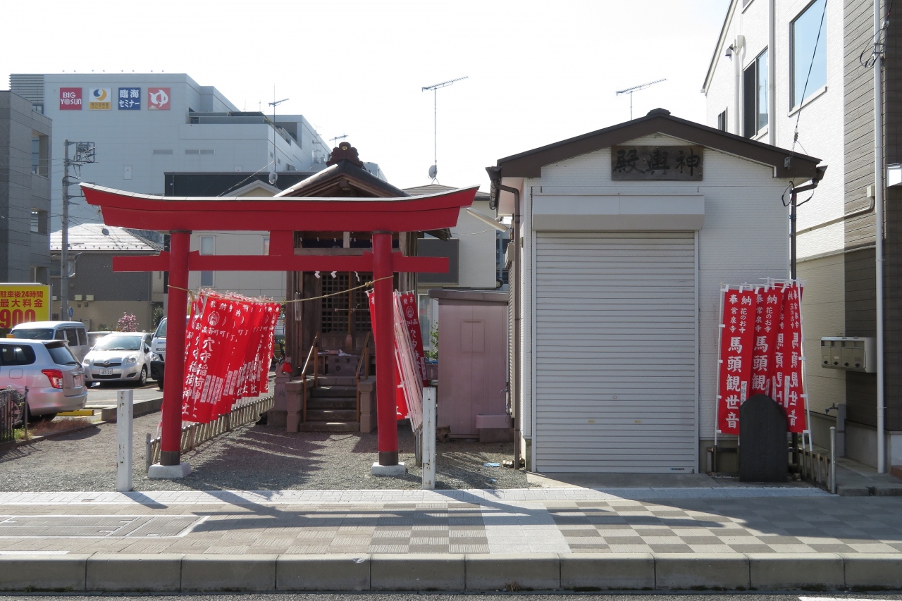 高座渋谷駅からほど近いところにあり、区画整理事業が行われて周辺が小ぎれいになっているところに、神社が鎮座しています。前面に藤沢街道(この辺りでは滝山街道とも呼ばれています)が南北に続き、往来した人も参拝したことでしょう。社の隣には神輿殿と馬頭観音碑もあります。