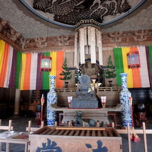 五色のカラフルな布に囲まれた真ん中に釈迦苦行像。