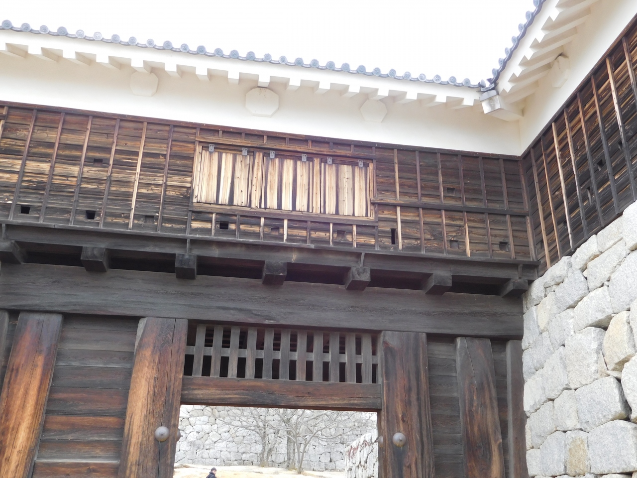 松山城の本丸広場に向かう手前側にある重要な櫓門です。この門を抜けると、本丸広場が広がっていますが、敵の侵入をなんとか防ぐような形で造られた門という印象がありました。筒井門の奥には、小さめの門「隠門」がありましたが、多くの人は手前側にある「筒井門」を通って、本丸へと向かって行きました。