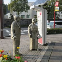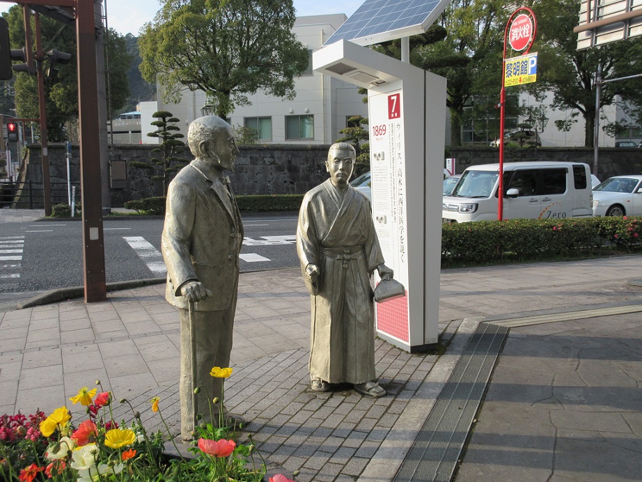 鹿児島城こと鶴丸城の近くに、このような西洋人と和装の若者の姿のモニュメントが置かれていました。説明を読むと薩摩藩が西洋医学を吸収するために招いたウィリアム・ウィリスと、その門下生の高木兼寛の像とのこと。幕末から明治に移り変わる時代、精神的な技術とともに医学までも習得し、普及させようとした薩摩の先見性を物語るエピソードだと思い興味を惹かれました。高木の利発そうな顔が実に印象的でした。
