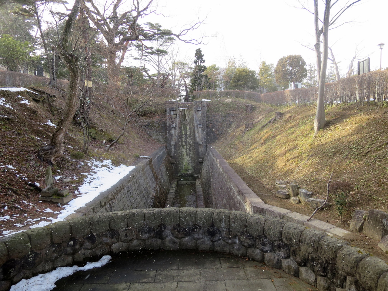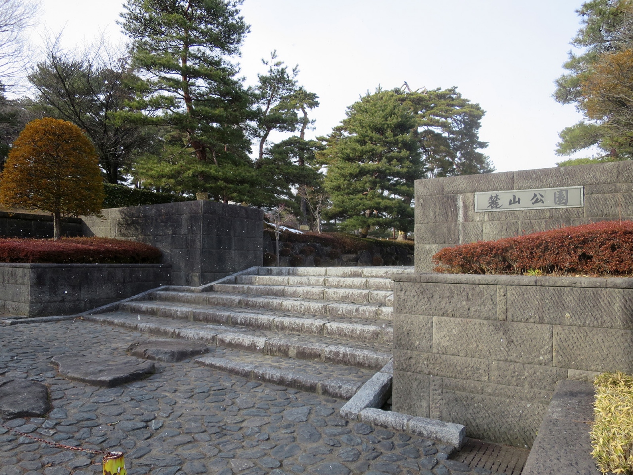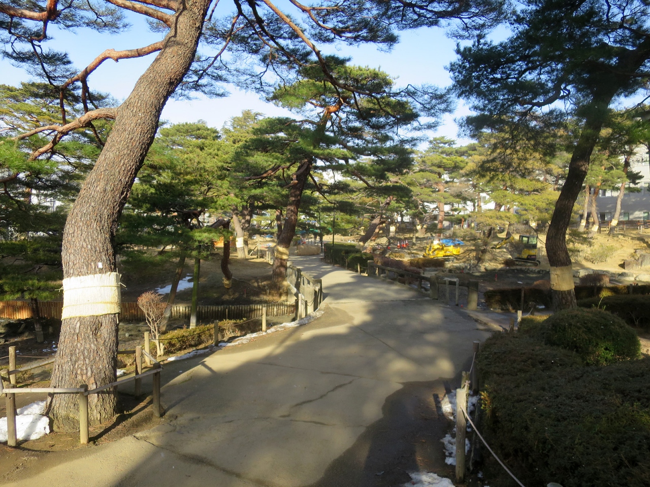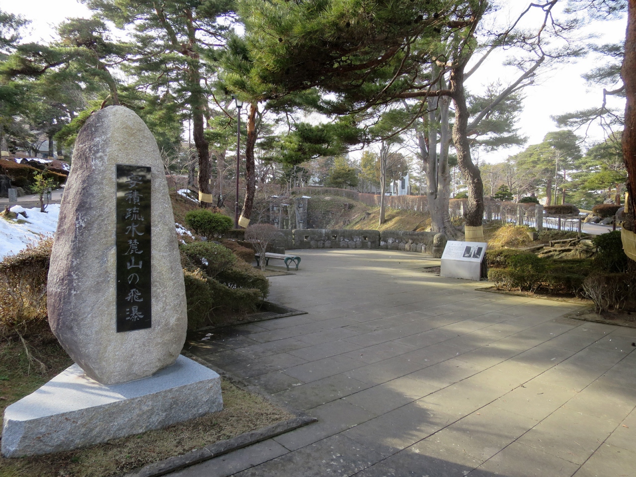 文化通り側から公園に入ると石畳に松並木、右手に茶屋風の休憩所があるなど、和風の都市公園といった趣です。左手は小高い丘で、斜面には日清戦争の従軍記念碑などいくつかの碑、頂上部には何かの社の跡もありましたし、丘の向こう側には第二次大戦の慰霊碑もあったりと、平和公園的役割もあるのかも知れません。この公園は日本遺産を構成する”安積疏水麓山の飛瀑”と名付けられた安積疏水を記念する滝があることでも知られていますが、水は出てはいませんでした。ただ2018年2月現在、公園の3分の1ほどが整備中で弁天池の水も抜かれており、ちょっと残念ではありました。