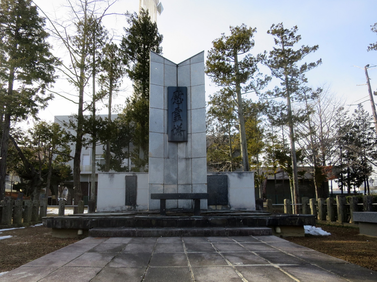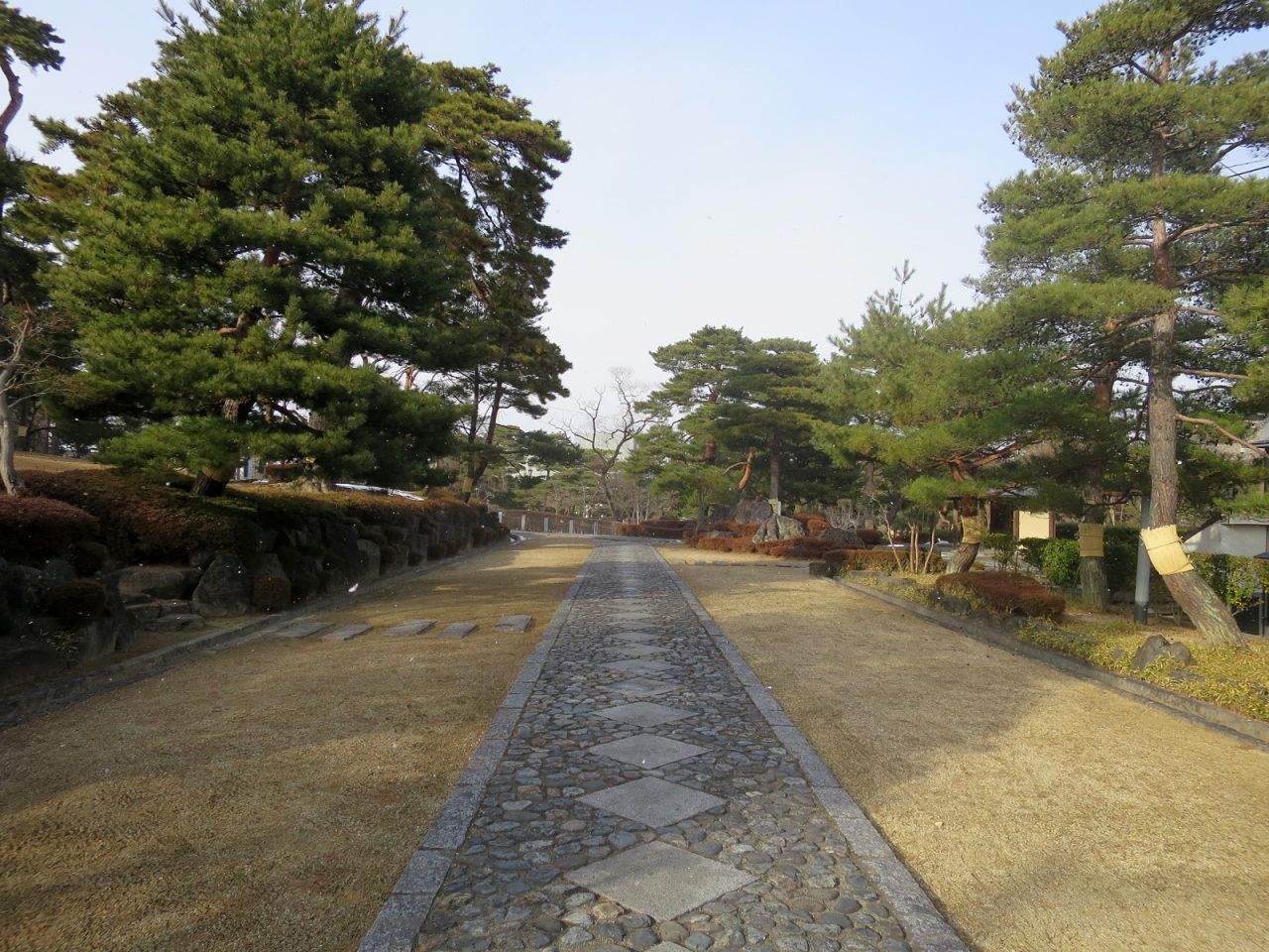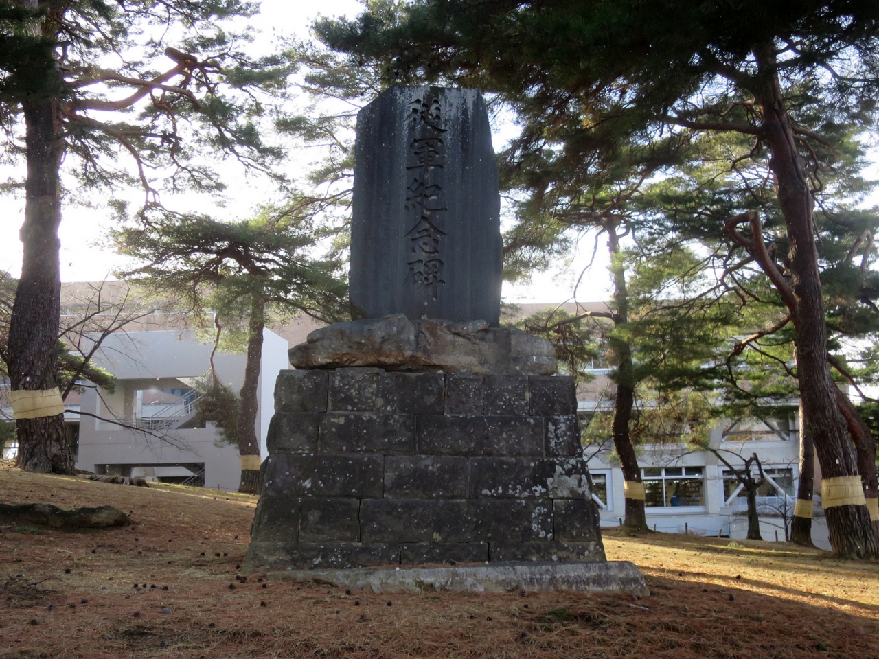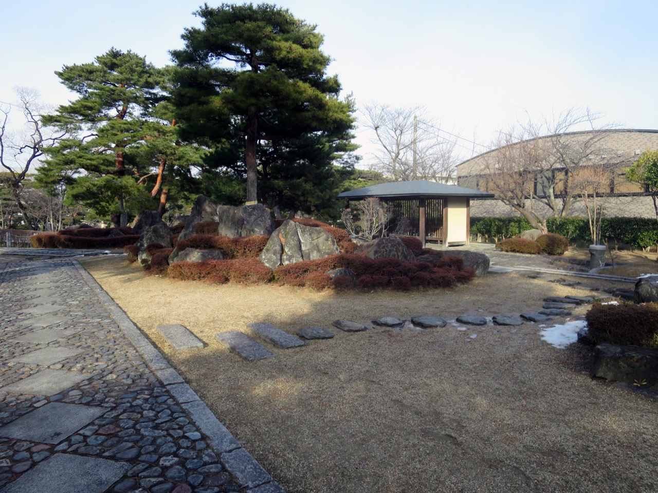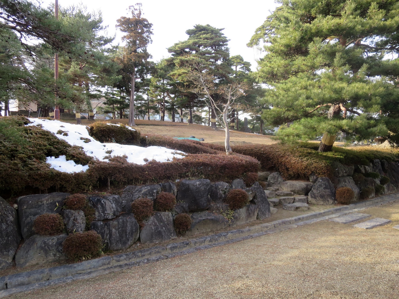 文化通り側から公園に入ると石畳に松並木、右手に茶屋風の休憩所があるなど、和風の都市公園といった趣です。左手は小高い丘で、斜面には日清戦争の従軍記念碑などいくつかの碑、頂上部には何かの社の跡もありましたし、丘の向こう側には第二次大戦の慰霊碑もあったりと、平和公園的役割もあるのかも知れません。この公園は日本遺産を構成する”安積疏水麓山の飛瀑”と名付けられた安積疏水を記念する滝があることでも知られていますが、水は出てはいませんでした。ただ2018年2月現在、公園の3分の1ほどが整備中で弁天池の水も抜かれており、ちょっと残念ではありました。