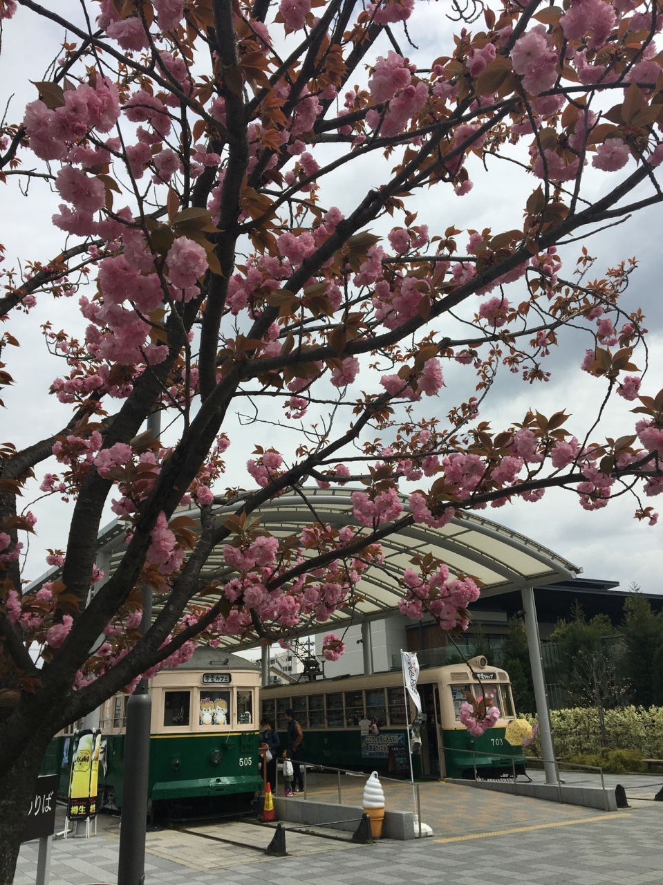 梅小路公園内にある市電は片道150円で乗ることが出来ます。八重桜が満開で綺麗だったので、初めて乗ってみました。市電が到着する場所にこの市電カフェがあります。少し肌寒い日だったので、ホットコーヒーを飲みました。電車が好きなお子さんは喜ぶと思います。