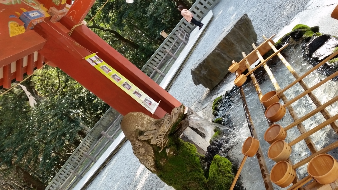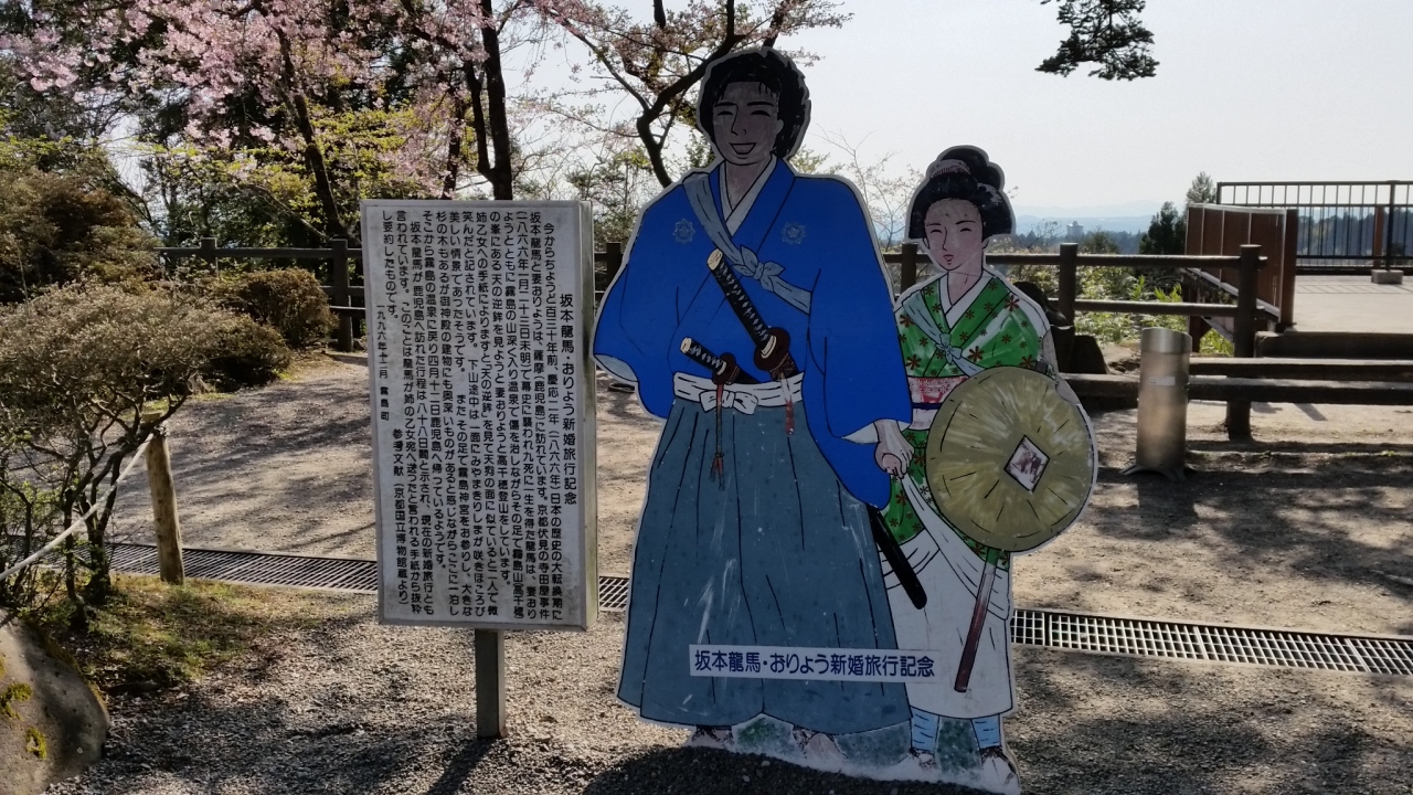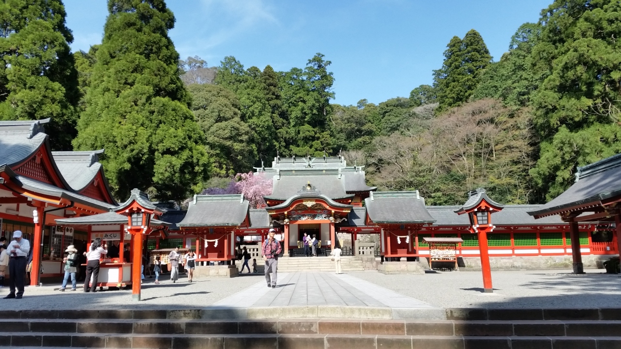 宿泊するホテルに霧島神宮駅までお迎えに来てもらい、人間だけここの上の駐車場で降ろして貰いました。長い階段を登らずに済んで助かりました。桜の季節で、満開、朱塗りの柱と青空がマッチして大変美しかったです。坂本龍馬とお龍が新婚旅行に来たところです。