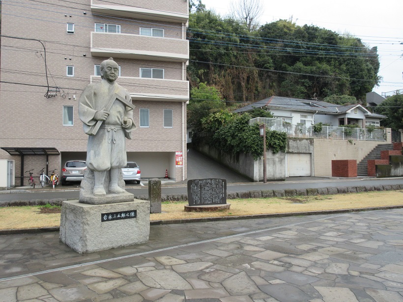 錦海湾に面した石橋公園の一角に、かつての肥後の国、熊本県から招かれ甲突川に石橋をかけた技術者である岩永三五郎の像が立っていました。肖像画などの無い人物なのか、特徴の無い顔に仕上がっていました。設計図をもって現場に立ち、職人らに指示を出す姿を表現しているように見えました。