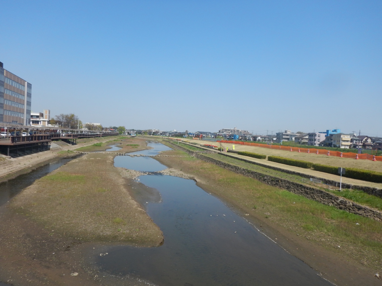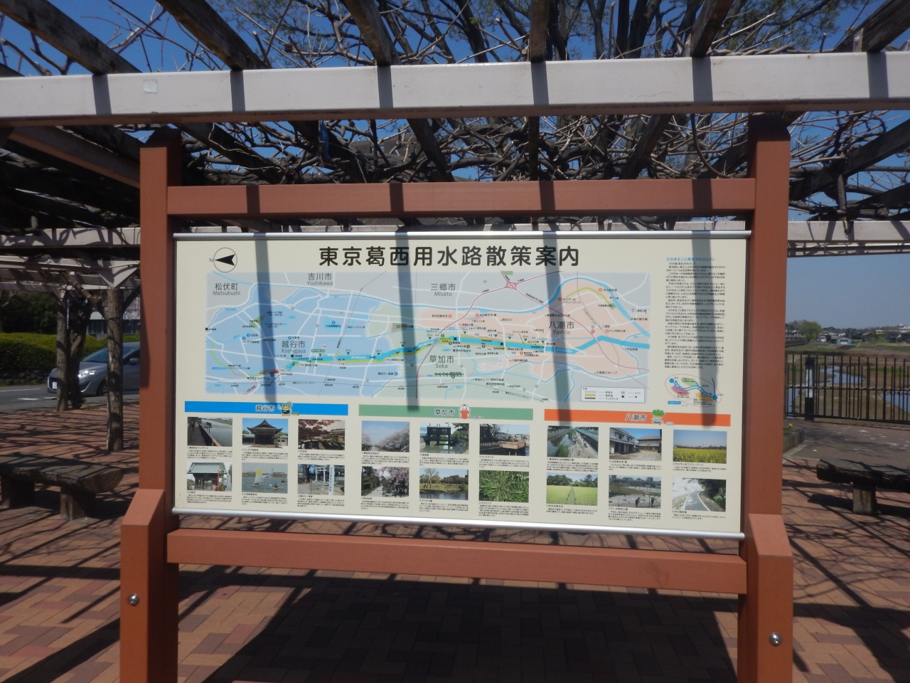4月下旬になると水が入るが、3月下旬だとまだ水がほとんどない。そのわずかな水の中を鴨が泳いでいた。葛西親水緑道の方にはチューリップが満開だった。平和橋としらこばと橋の間は瓦曽根の溜井という農業用水を溜めるところなので幅がかなり広くなっている。