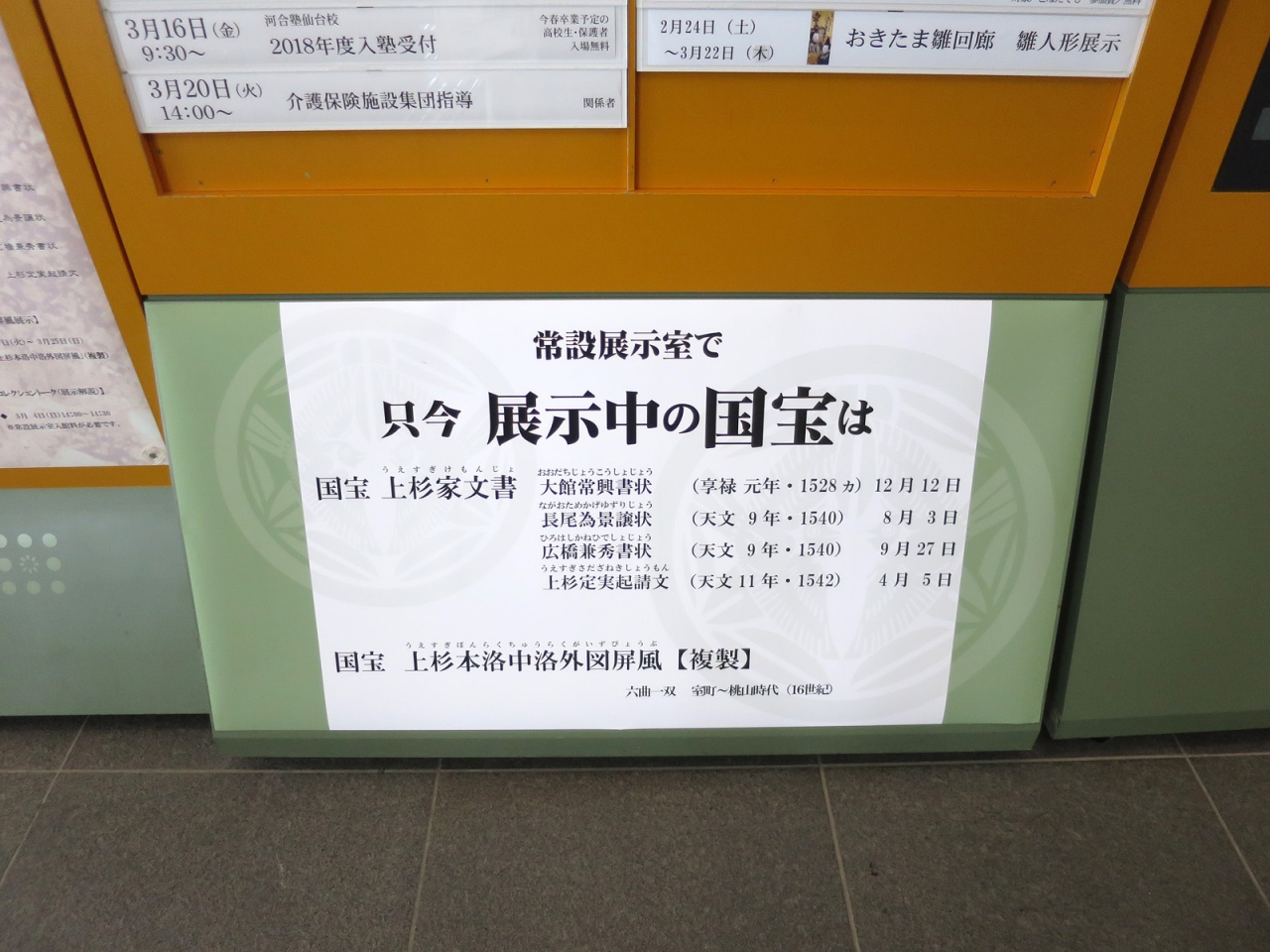 博物館は常設展示室と企画展示室の2つに分かれています。常設展示室は上杉家に強い誇りを持つ米沢らしいものになっています。たしかに関ヶ原の戦い前後、上杉景勝時代からの上杉家の物語はドラマチックですし、直江兼続・前田慶次・上杉治憲(鷹山)といった魅力ある人物も輩出したので、多くの人が米沢上杉家の歴史を知ったらハマりそうではあります。こちらでは国宝を含む上杉家所蔵品などを展示するだけでなく、映画を観たり、昔の手紙の折り方を憶えたり、火縄銃を撃ったりしながら、米沢転封以来の上杉家の歴史と文化を学ぶことができるようになっていますし、同時に郷土置賜・米沢の偉人を顕彰・紹介するスペースもありました。私が訪れた時の企画展示室のテーマは“米沢ゆかりの絵師たち”で、内容は題名そのものでした。不思議だったのは常設展示室の料金が410円、企画展示室とのセット券も同じく410円だったことです。企画展示によって違うようではありますが、びっくりして聞き直してしまいました(笑)。ミュージアムショップもちょっと惹かれましたが、荷物の関係で諦めました。次回は何か買い物してしまいそうです。