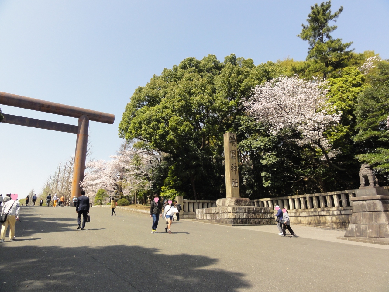 日帰りバスツアーでお花見兼ね、初めて靖国神社に行きました。神社に続く参道は幅広く、参拝者のバスも停車していました。境内や本殿は想像してたより大きくなかったです。桜満開の下、能楽堂ではミニコンサートが行われていました。