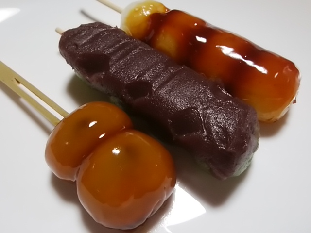 あんこの入ったみたらし団子が気になっていました。それを1本129円(税込)と、普通のみたらし団子、くさ団子を1本ずつ各108円(税込)を購入です。