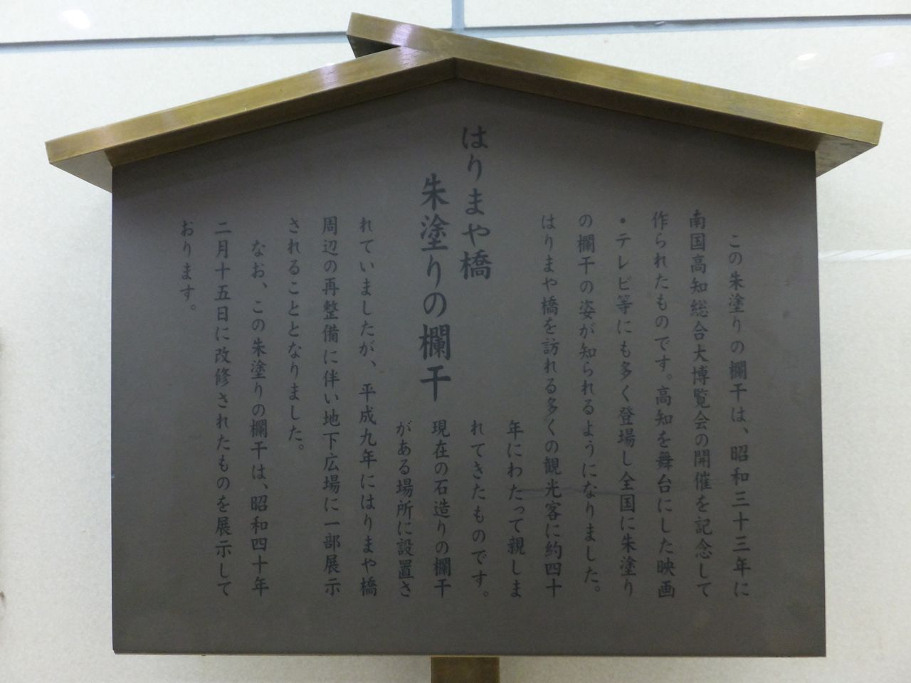 いつのまにかはりまや橋交差点の地下に観光スペースができてました。おそらくは地下横断歩道を作るついでだとは思うのですが、昔のはりまや橋の欄干が展示してあったり、過去ら現在までのはりまや橋の解説展示があったりで、面白かったです。昔との違いを再確認したい場合はぜひとも訪問を。