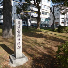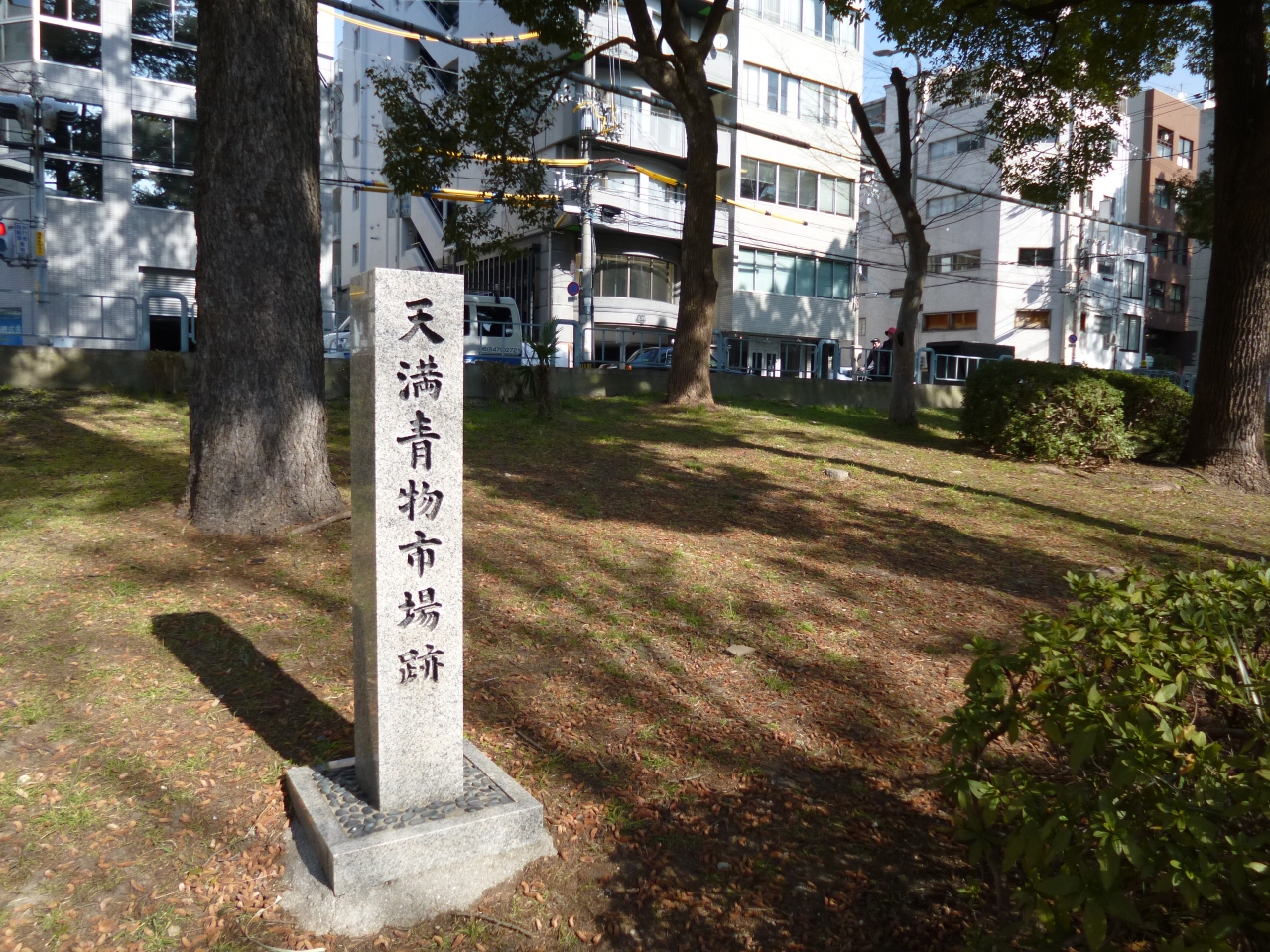 「天満青物市場跡の碑」は、大川べりに広がる「南天満公園」の一画にあります。ただ、この近くにはインパクトのある大きな石碑がたくさんあるので、あまり印象に残らないものでした。