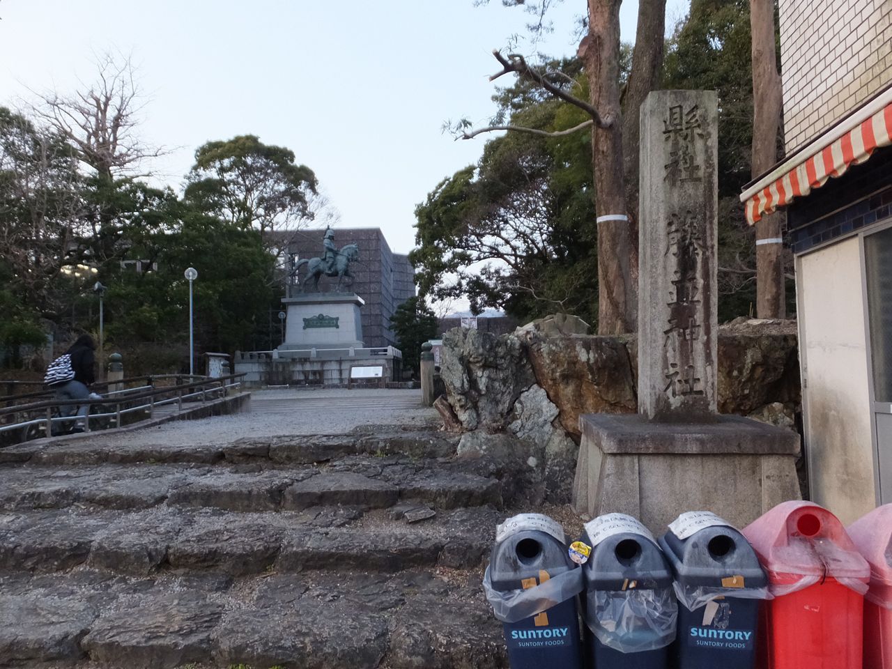 高知城の追手門の外、藤並公園の入口に高知県を代表する(はずの)神社である藤並神社の碑が立っています。が、目の前はゴミ箱。そしてその向こうには城主だった山内一豊の騎馬像が。共に高知を代表するものとひとであるのになんかちょっと寂しくなるような場所でした。