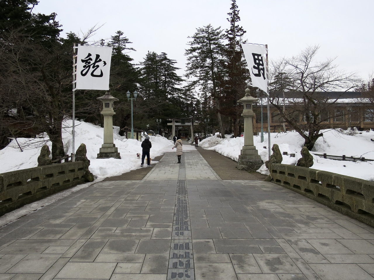 - 雪の残るオフシーズンの朝、それも参道脇の階段を上った場所なので、人の姿はありませんでした