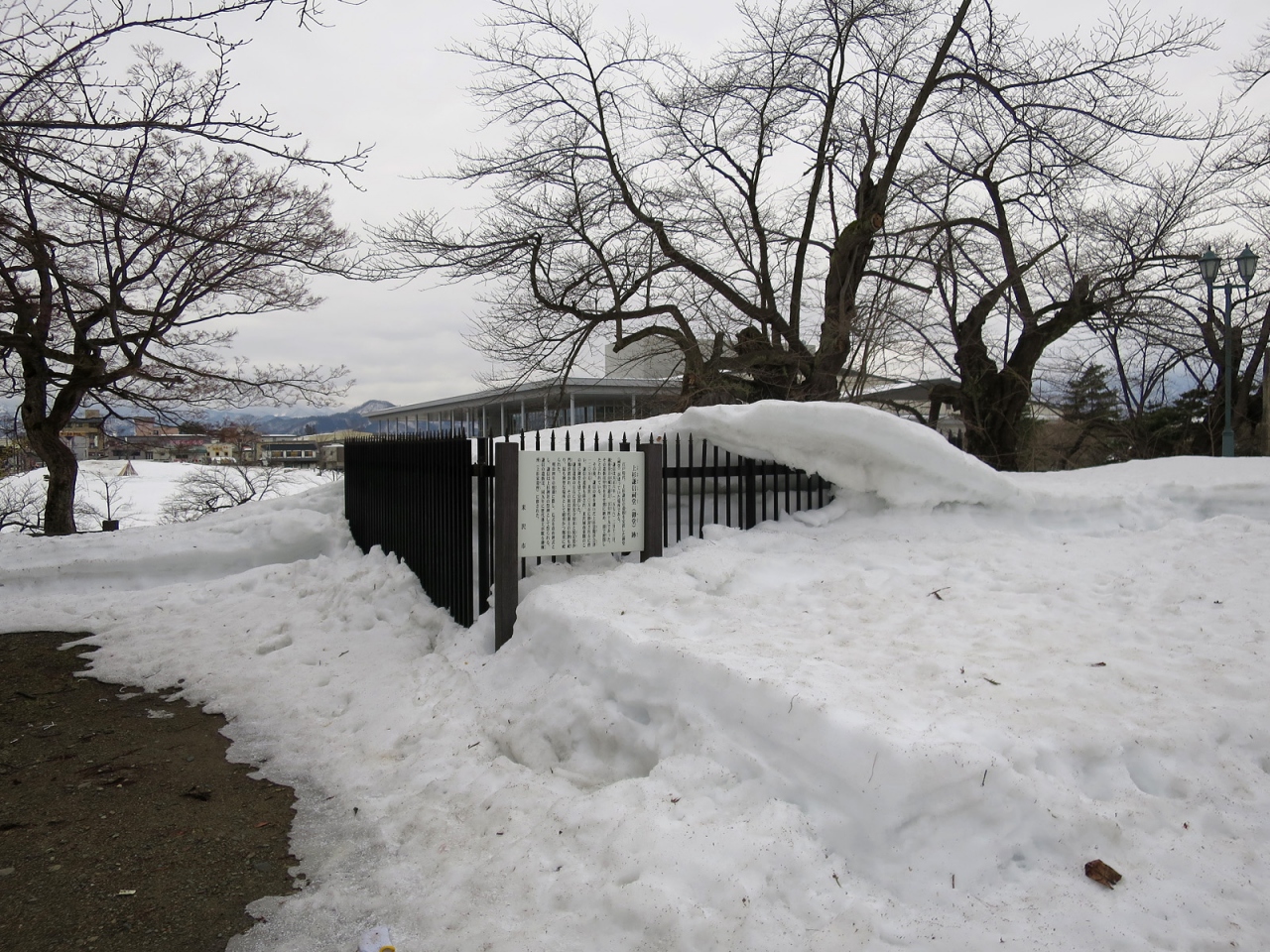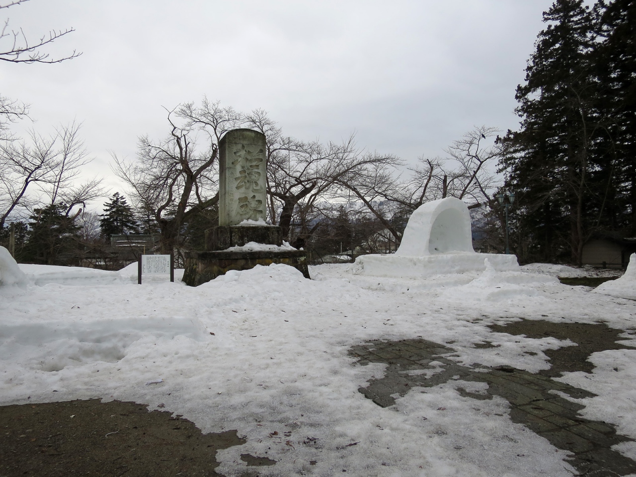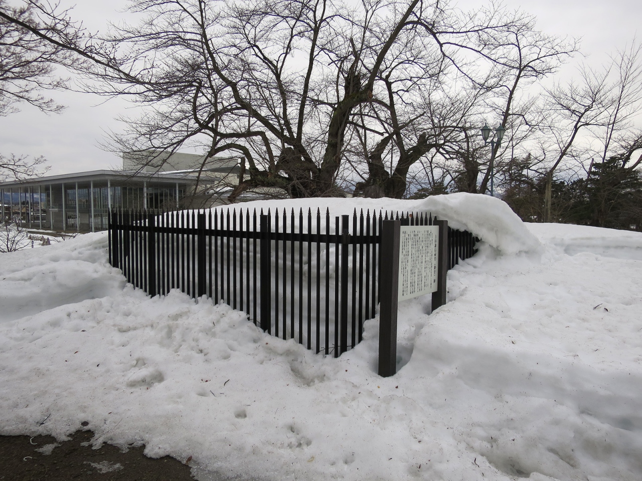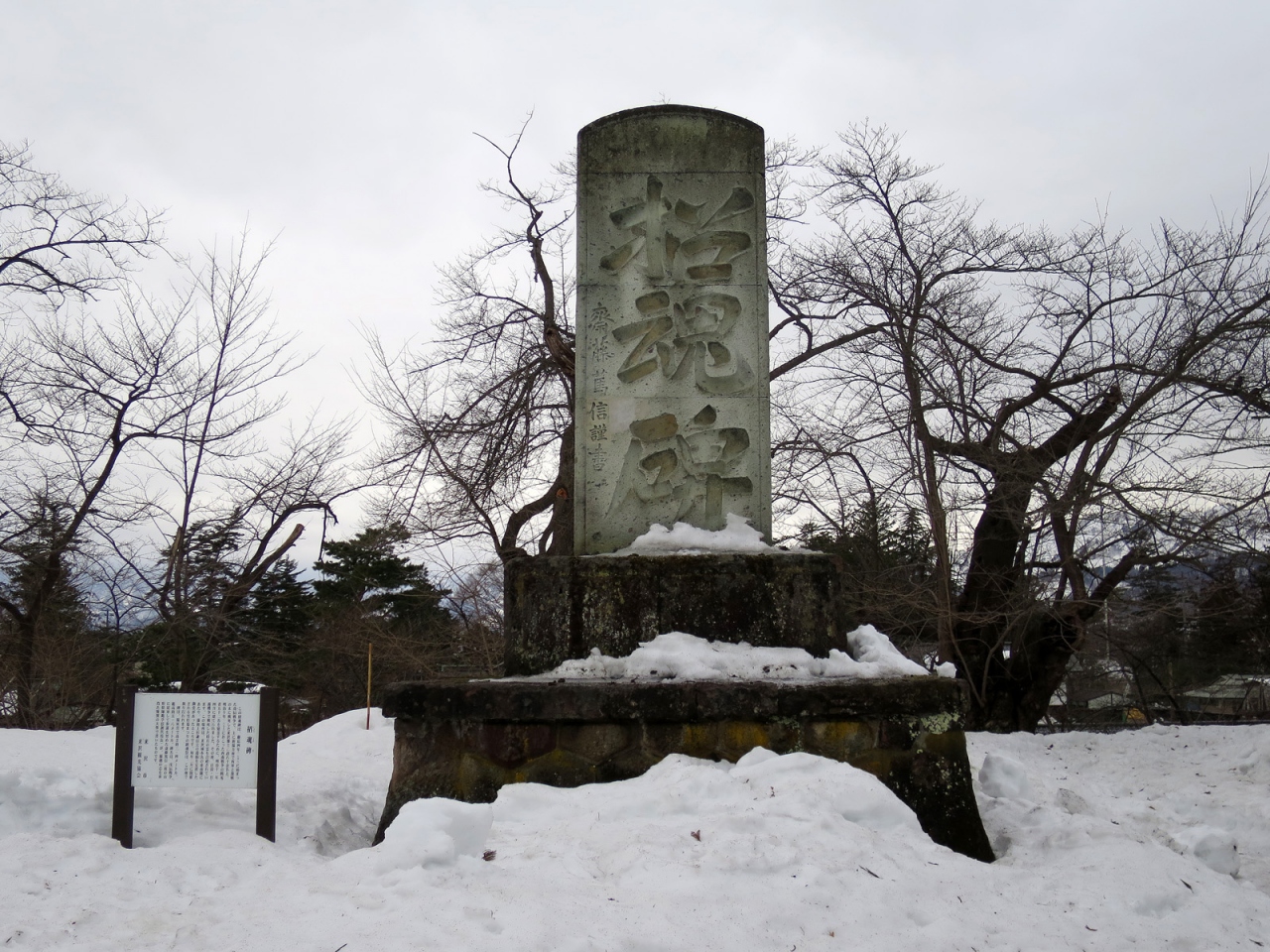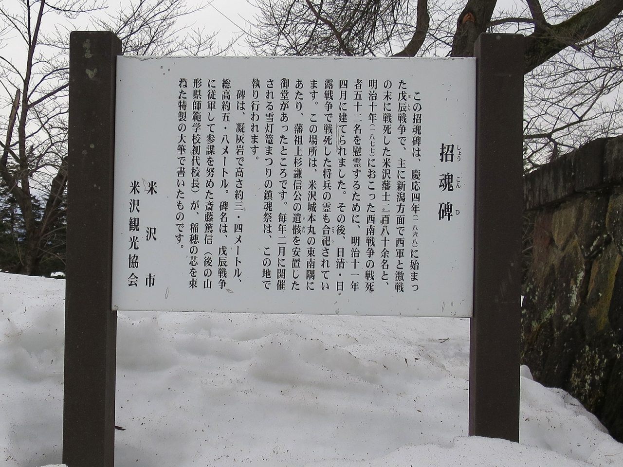 「伝国の杜」と「上杉城史苑」の間から「松が岬公園」に入り、堀に架かる舞鶴橋を渡ってすぐ左手の階段を上ったところに大きな「招魂碑」がありました。案内板には、この石碑の大きさや碑名といった説明と並んで、戊辰戦争や西南戦争の犠牲者を慰霊するために建てられたという建立の目的、また日清戦争や日露戦争の犠牲者も合祀されていることなどが記されていました。しかし考えてみれば、国に殉じたと認められている人々は一般的には招魂社(=護国神社、靖国神社)に祀られているはずが、こちらは招魂碑。そうか、米沢は戊辰戦争では西軍(薩長側の自称は官軍)と戦って敗れた側でしたね。日清・日露両戦役での犠牲者は間違いなく招魂社に入るはずが、そうした英霊も合祀されているとあるのは米沢の意地でしょうか?