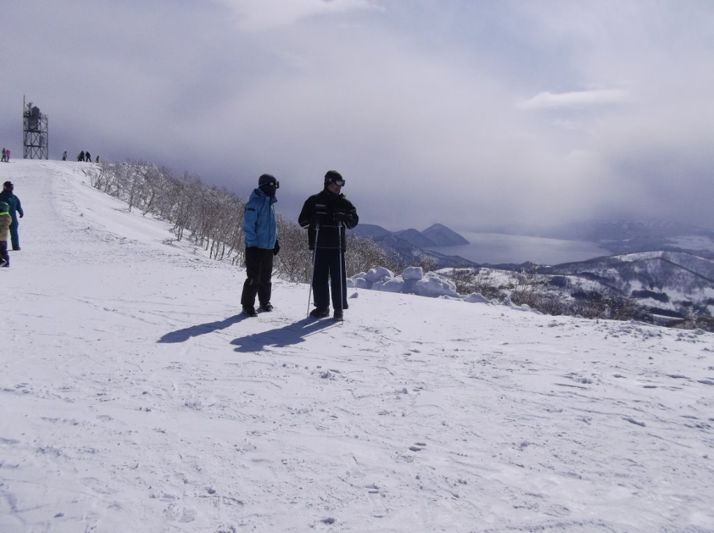 晴れた日には後方羊蹄山や洞爺湖がきれい。知らない者同士も写真を撮り合ってスキーって楽しいなと幸せな気分になります。北海道スキーが初めての人をルスツに連れて行って大いに感謝されました。