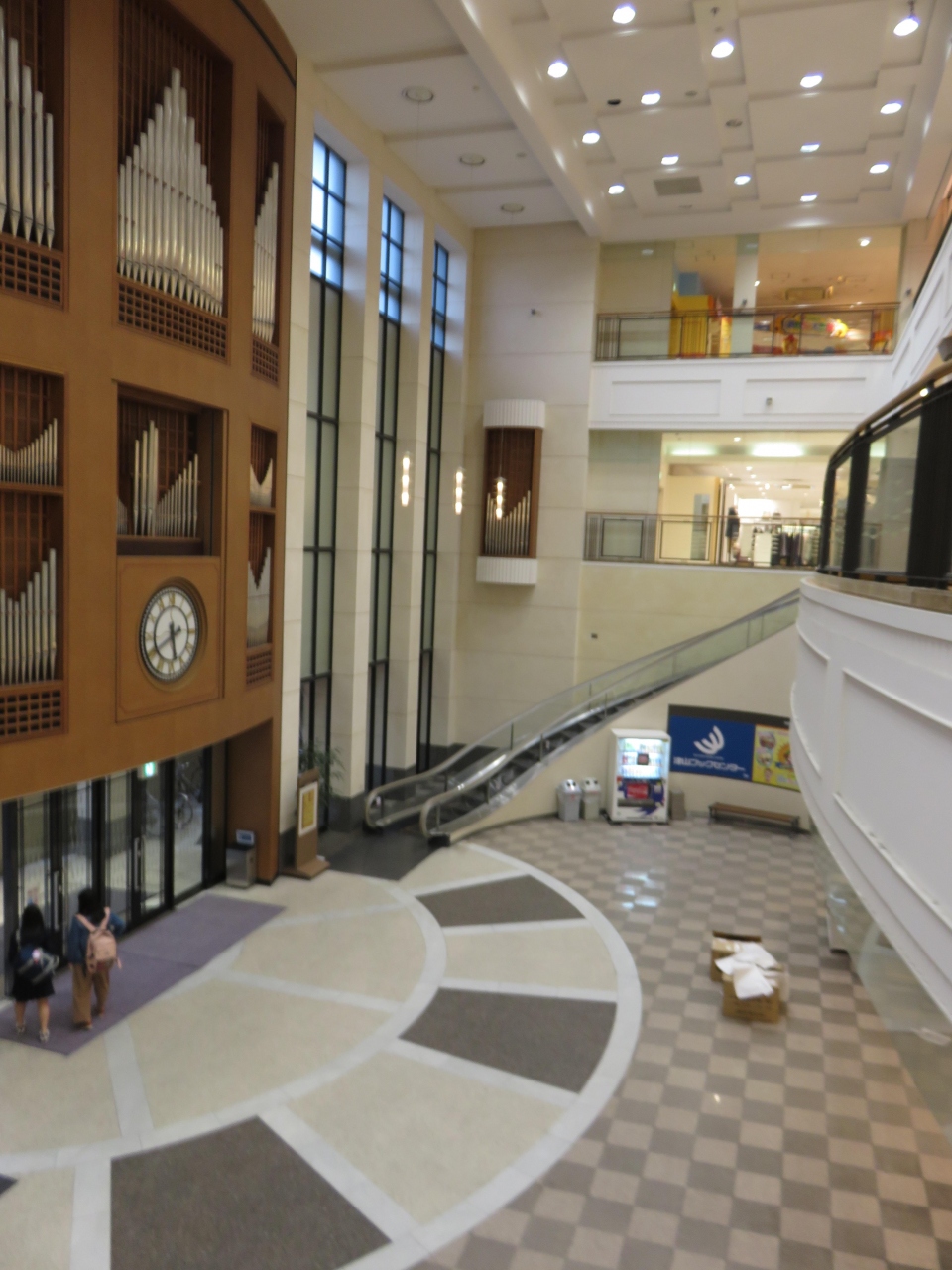 商店街を歩くと、つきあたりに天満屋がある。中に入ると一階のロビー空間にパイプオルガンがあるので、驚く!なぜこんなところに?二階にエスカレーターで上がると、演奏用の鍵盤も確かに設置してある。最初からここにあったのだろうか?