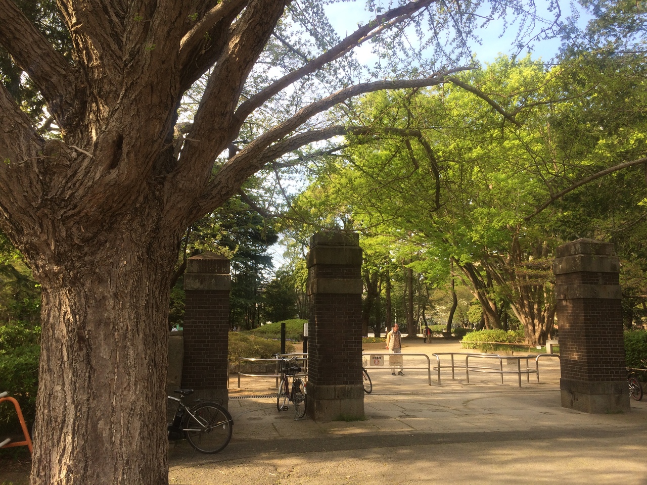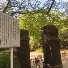 松戸中央公園の正面出入口にある4つの門柱で、公園内から見たら古めかしい煉瓦でした。高さは3メートルぐらいで、大正9年に作られたとのことで周りは現代の建物ばかりですが、この柱だけが年代ものなので一際目立つ建物でした。