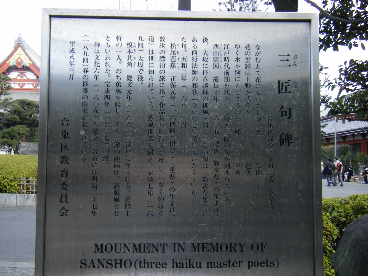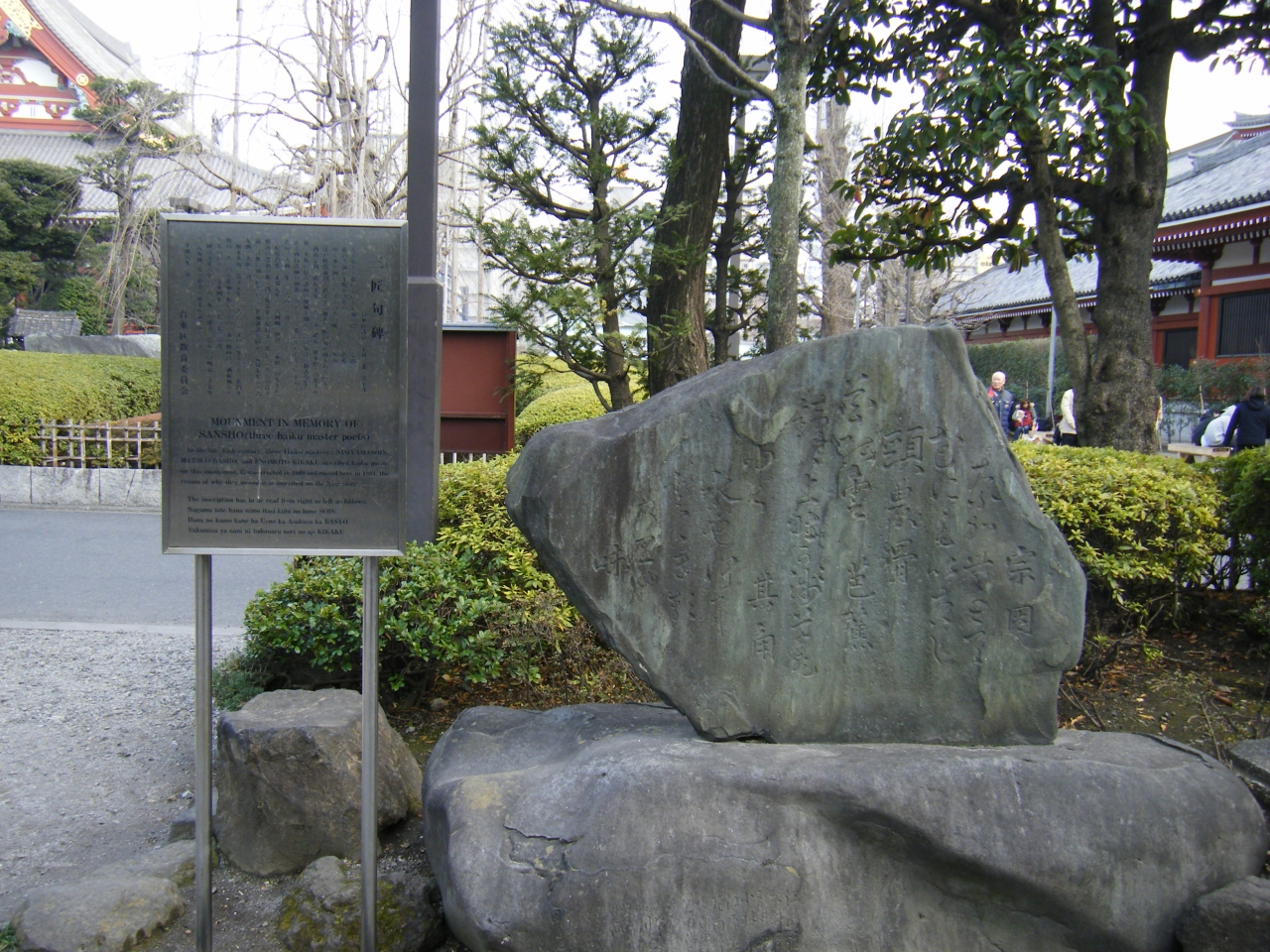 浅草寺境内の西側、新奥山と呼ばれる一角にこの石碑はあります。この石碑には江戸時代前期を代表する俳人三匠(西山宗因、松尾芭蕉、榎本其角)の句が刻まれているそうですが、正直申し上げて松尾芭蕉以外のお二人は名前を存じ上げておりませんでした。なぜこの3名の句が一つの石碑に刻まれているのかなどは案内板に書かれておらず、いまいちこの地にある意味などもわかりませんでした。松尾芭蕉の句は浅草を詠んだ句なので理解はできるのですが、他のお二方の句についてはあまり関係なさそうに見えるのですが。