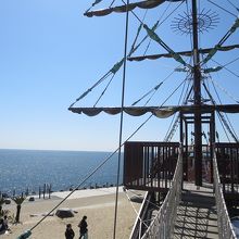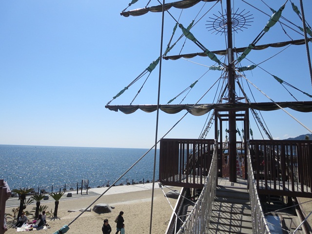 海岸にある広い公園で、子供達で賑わっていました。海賊船の形の遊具がかっこいいです。船の遊具越しに海を眺めると大人も童心に帰りそうになります。水遊びが出来る流れもあったり、子連れならかなりの時間ここで遊べそうです。