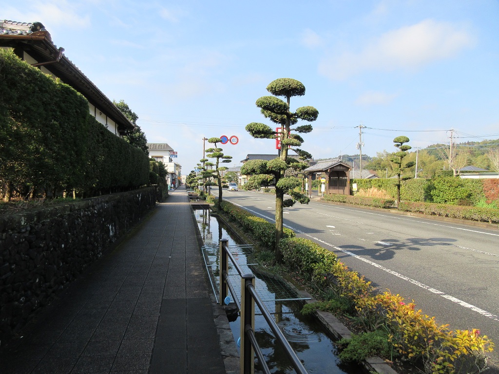 バスで知覧に到着、武家屋敷群入口のバス停をおり、武家屋敷に向かった歩き始めると、足元に水路に鯉が泳いでいるのが見えました。よく見ると幹線道路に沿ってかなり長い距離に渡って水路が続いていました。武家屋敷群の近くにこのような魚の泳ぐ水路があるというのも風情があって良いと思いました。綺麗に剪定された街路樹も含め、武家屋敷の雰囲気によく合っていました。