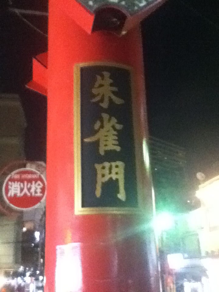 横浜中華街の南東側の門である。善隣門や朝陽門に比べ、観光客はやや少ない。お勧めの点は、朱雀門の文字の下や両側には羽を広げた朱雀があり美しいこと、朱雀門の文字の上には朱色の装飾があり艶やかであること、夜はライトアップされ綺麗であること、この付近は人通りが比較的少なく横浜関帝廟や濱媽祖廟周辺に行きやすいこと、その途中には旨い中華店や雑貨等のショップが並び、食事や買物を楽しめること、朱雀門の南側には元町があり買物を楽しめることである。