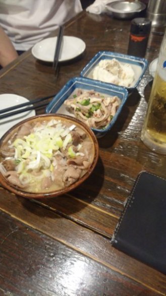 2軒目なので、熱燗と焼きとんともつ煮でまったり。美味しく雰囲気も良いしお酒がすすむ。名物らしいネギ焼き!?は美味しかった。