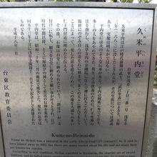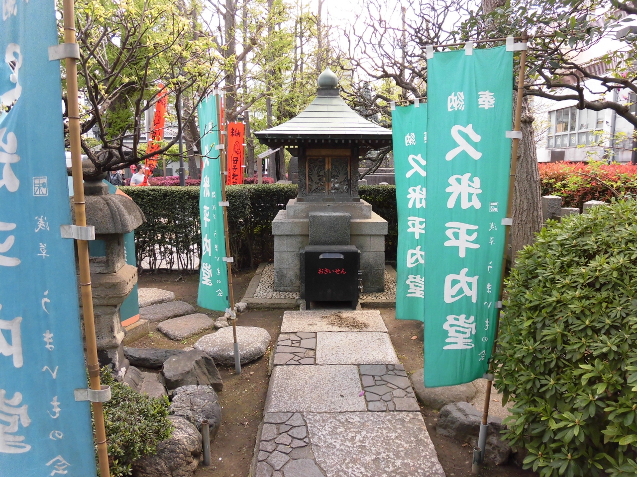 宝蔵門の手前右側に、ひっそりと佇んでいるお堂があります。お堂の手前にある緑色ののぼりの方が目立っています。講談にもよく登場する人物、久米平内ですが、ここは縁結びの神様として有名です。小さなお堂なので、ここを目当てに探さないと見過ごしてしまうと思います。行かれる方は緑色ののぼりを目印に探してください。