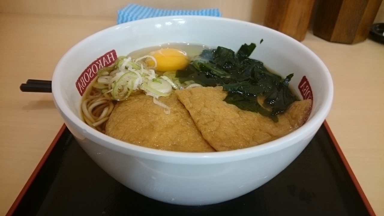 月見そばを食べました。とても美味しいです。そばの上にはワカメで栄養満点です。お好みで追加できるコロッケをのせるとボリューム感がアップします。オススメです。