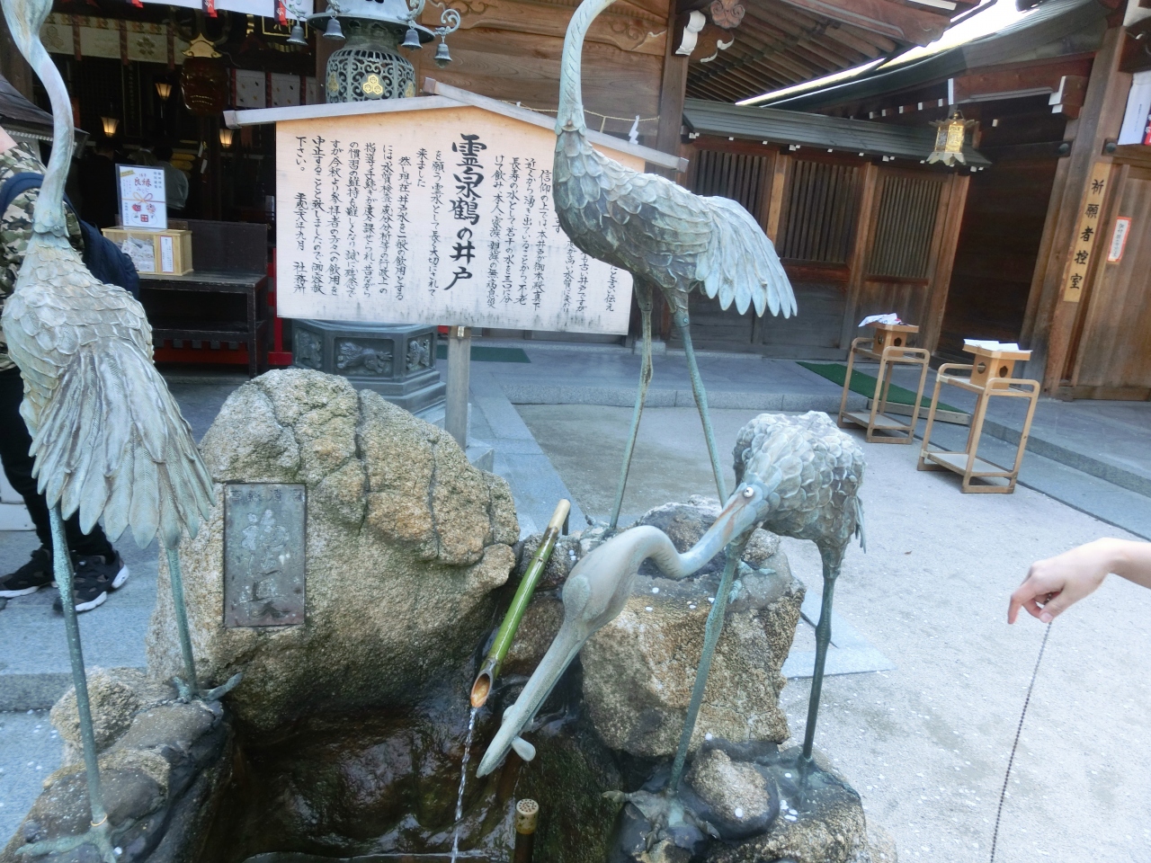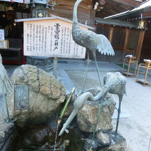 鶴の置物に囲まれた噴水のような井戸施設。