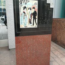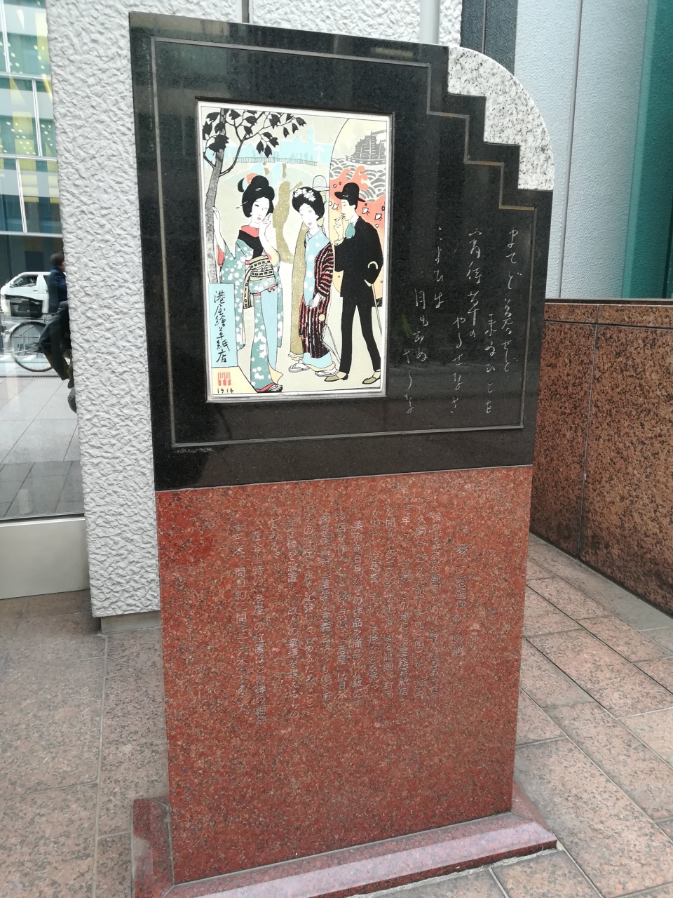 東京駅の少し北の呉服橋交差点の近くに、竹久夢二がこの地に夢二のデザインによる版画、絵葉書、手拭、半襟などを売った「港屋絵草紙店」を開いたことを記念した碑がありました。夢二のデザインの絵がついたきれいな記念碑でした。