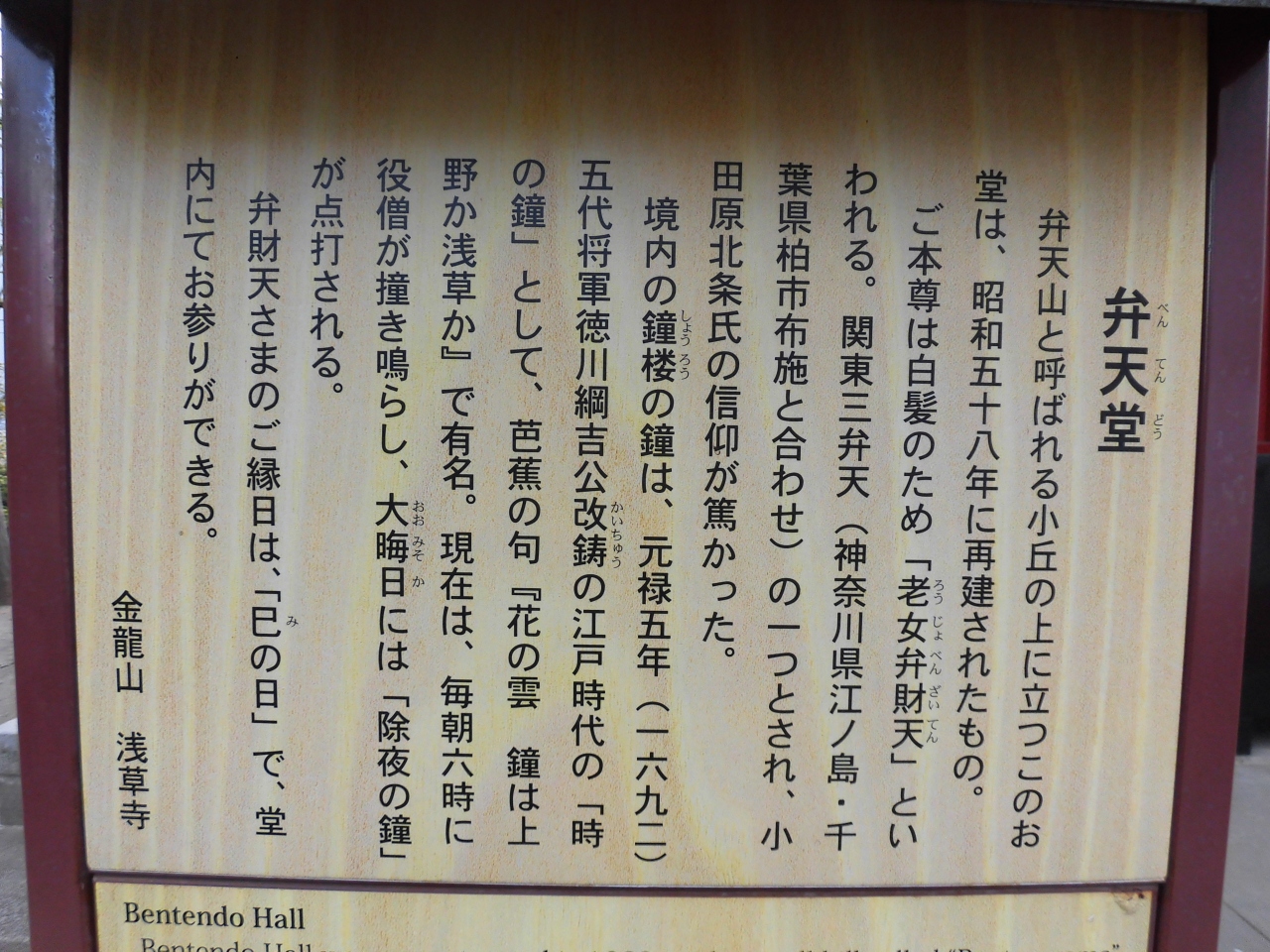 宝蔵門の手前を右(東)側へ進み、二尊仏を超えた先にある小高い丘の上にあります。石段を登った上に弁天堂があります。石段の下には松尾芭蕉の句碑もありました。2018年4月8日現在、弁天堂の右側は工事のため入れませんでした。