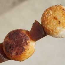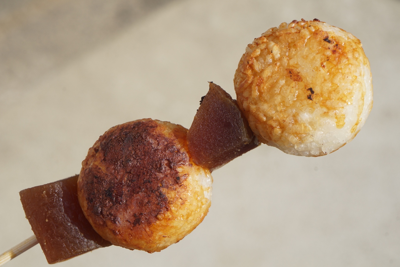 壽俵屋というのは、奈良漬のお店なんですが、今の大人気は井上犬山邸の方で販売している「醤油おこげ串」。小さな焼きおにぎりとけっこうな塊りの奈良漬を串に刺したもの。焼きおにぎりの方はどうかなと思いましたが、奈良漬けの方はグッド。ちょっと楽しい串ものです。