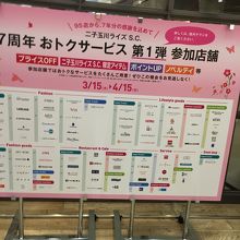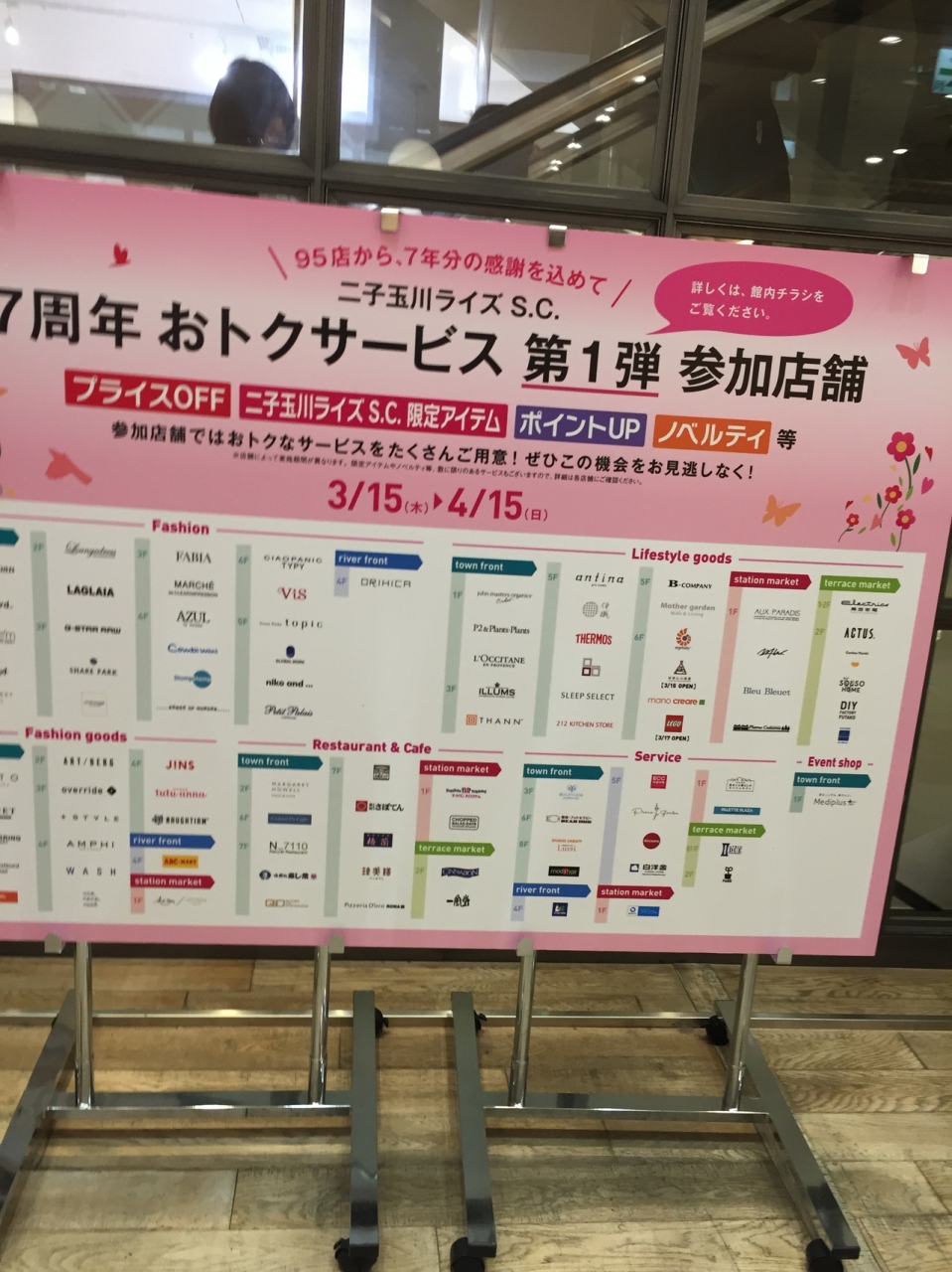 お買い物しに行き初めて知ったのですが4月の 15日までライズショッピングセンターはキャンペーン中です。7周年を記念したイベントでお得にお買い物ができます。お店によってポイントが倍になったりノベルティーをいただけたり割引があったり様々ですがちょうどお買い物する人はラッキーです。参加店舗も決まっているのでチェックしながらお買い物すると良いと思います。