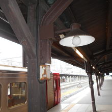 駅舎が工事中で足場に覆われており、残念ながら雰囲気があるとされる駅舎の見学ができませんでした。列車から降りたホームには年季の入った木製の屋根がかかり、照明器具や駅名表示も古めかしくて、懐かしの雰囲気をとどめていただけに、駅舎が見られないことが余計に残念でした。