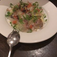 牡蠣のグラタンや珍しいチーズなど。鯛のカルパッチョも弾力があり美味しかったです。