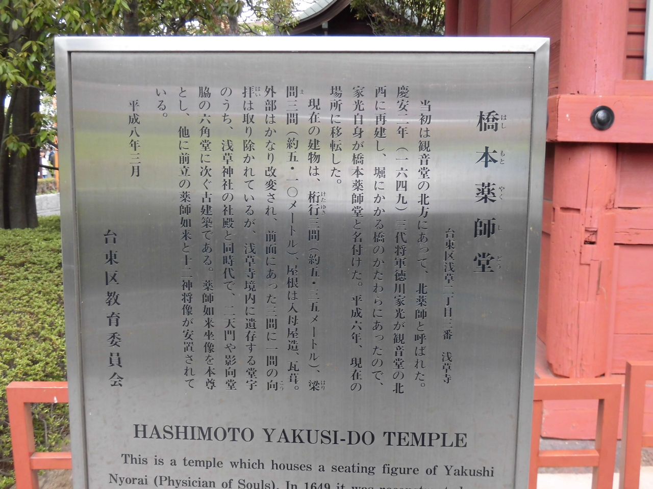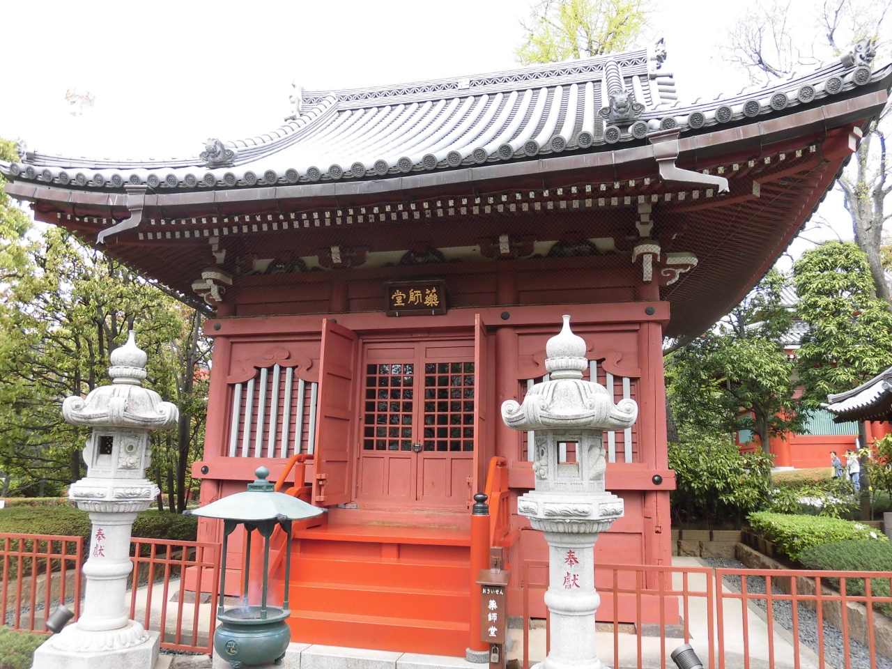 大きな建物が多い浅草寺の中ではとても小さく見えますが、薬師堂は歴史のある建物です。 薬師如来をおまつりするお堂で、約370年前に再建されたものです。案内看板には橋本薬師堂とありますが、これはこの建物が小川の小橋のたもとに建立されたからです。扉が閉まっていて、中を見られないことが残念でした。