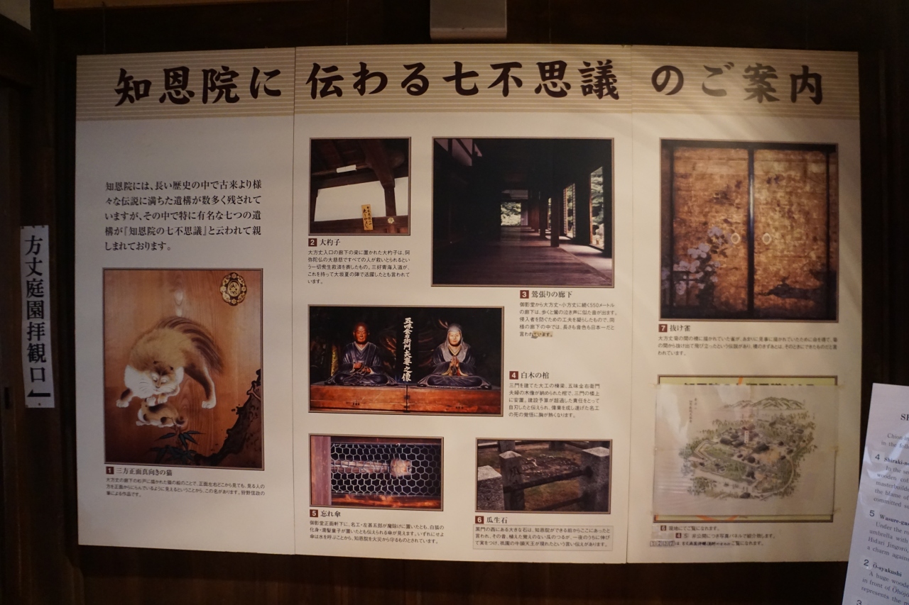 知恩院の七不思議は、鴬張りの廊下、白木の棺、忘れ傘、抜け雀、三方正面真向の猫、大杓子、瓜生石。方丈庭園の拝観コースの途中に、抜け雀、三方正面真向の猫はレプリカですが、本物も含めてポツポツと現れます。影堂には、説明パネルもあるので、それを確認してから有料エリアに入るといいと思います。