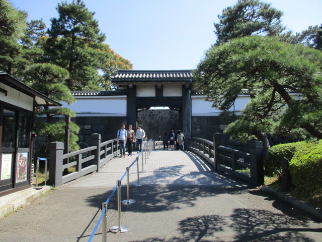 東京メトロ東西線竹橋駅から北の丸公園方面に紀伊国坂をゆっくり上ると右手の東京国立近代美術館を過ぎた先にある北桔橋門に歩いて10分ぐらいで着きます。北桔橋門は皇居東御苑への入り口で江戸城天守台に直接通じる重要な門であるため、防御力を高めるために、かつては濠を深くし跳ね橋になっていて敵の侵入を防ぐようになっていたそうです。現在でも深いお濠と石垣は健在で見ごたえあります。高い石垣の上に築地塀が築かれ、お濠の景色はとても美しいです。北の丸公園から皇居東御苑に入るのにはこの門を通って入城するのが便利でお勧めです。