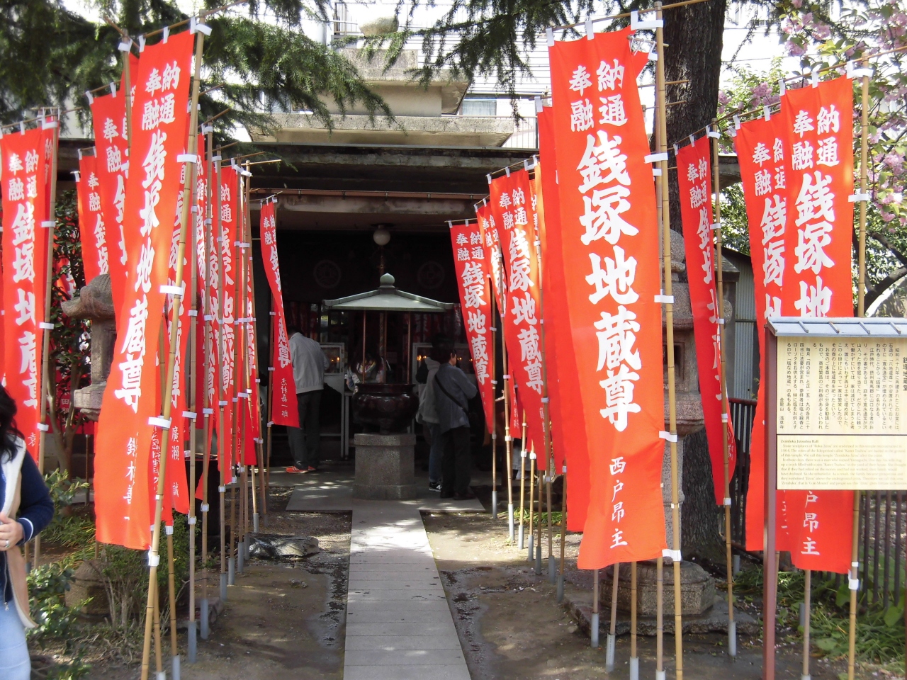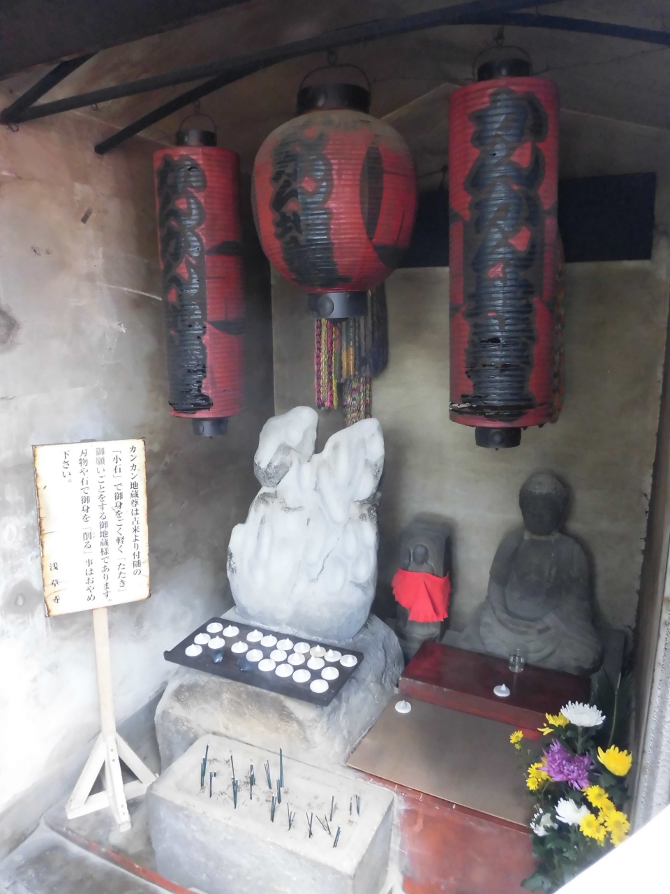 浅草寺の西北端にあり、赤い上りがたくさん立っていますのですぐにわかります。お堂はやや薄暗い中にあり、右側には「かんかん地蔵」があります。地蔵の前にある小石でかんかん地蔵の身体を叩くと「カン!カン!」と音を立てることから、この名前になったそうです。でも小石でもお地蔵様を叩くのは、気が引けますよね。